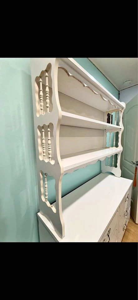 Sturdy, white Formica girls bedroom set including two dressers and a detachable hutch/bookshelf. Larger dresser measures 48" L x 18" D x 30" T. Detachable hutch measures 46" H x 11" W x 48" L. Smaller dresser measures 36" L x 18" W x 30" T. Features decorative brass handles.