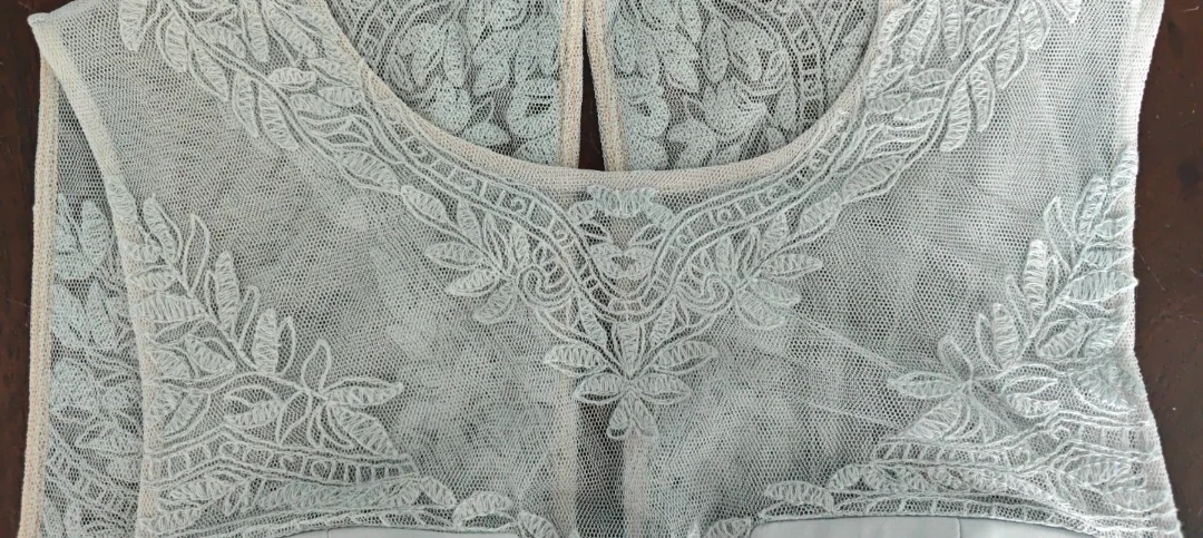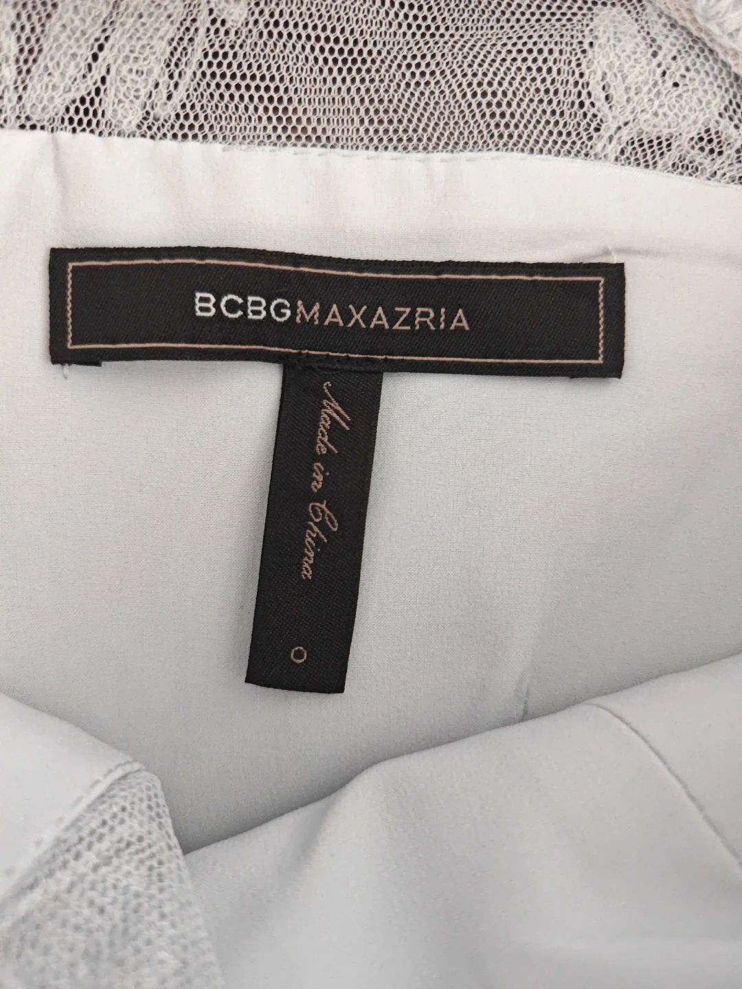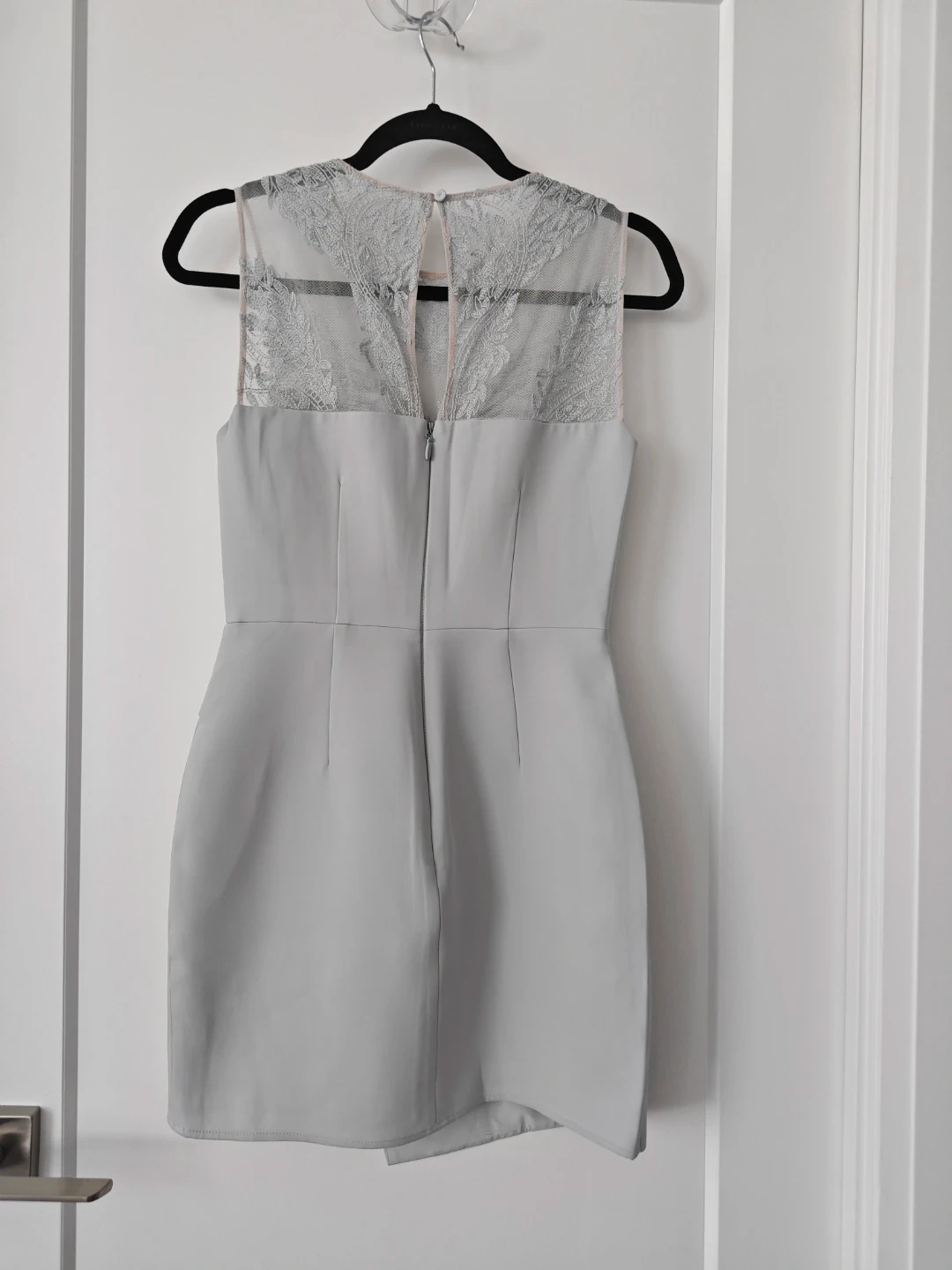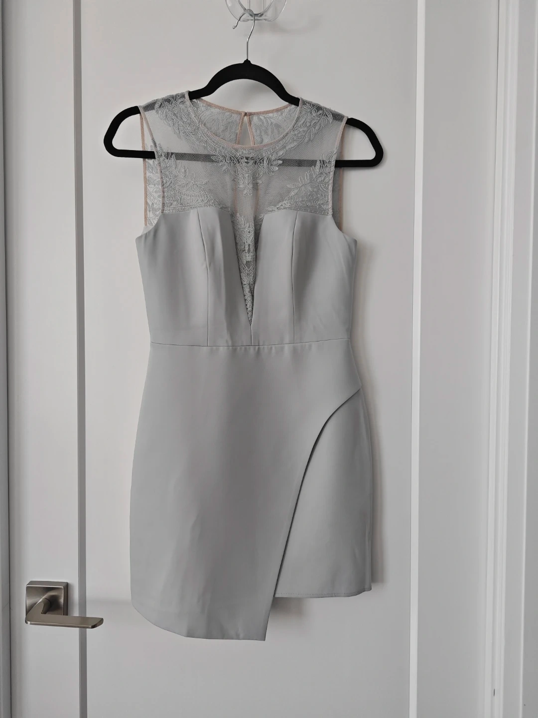 BCBGMAXAZRIA light grey blue hue with intricate lace detailing on the neckline and sheer panels. It's a sleeveless sheath style with a V-neck overlay. The dress has a zippered back closure. Perfect for a night out or special occasion