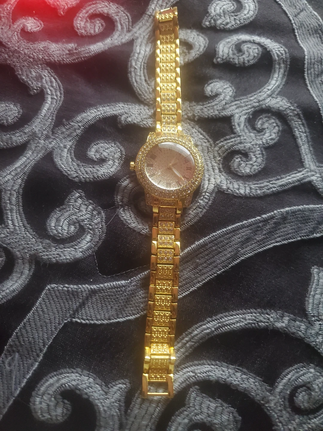 This gold-tone watch features a classic bracelet design and a round face with Roman numerals. The bezel is encrusted with rhinestones for a bit of sparkle. It's a stylish accessory for everyday wear or special occasions.