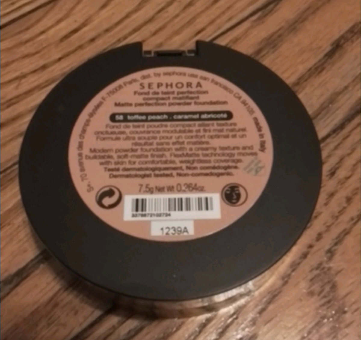 Selling a Sephora Matte Perfection Powder Foundation in the shade 58 Toffee Peach. It's a compact powder foundation with a creamy texture and soft-matte finish. It offers flexible technology that moves with skin for weightless coverage. The net weight is 7.5g or 0.264oz