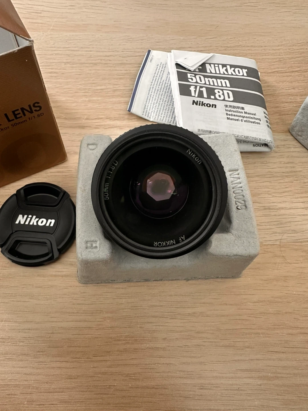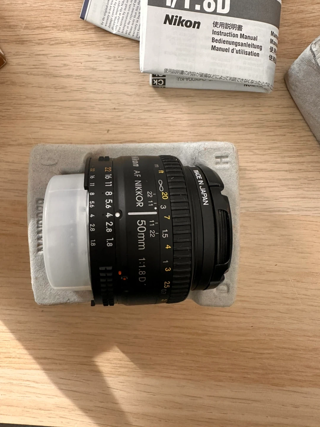 This is a Nikon AF Nikkor 50mm f/1.8D camera lens. It features a f/1.8 aperture for excellent low-light performance. The filter attachment size is 52mm. It's made in Japan and comes with its original box and lens cap.
