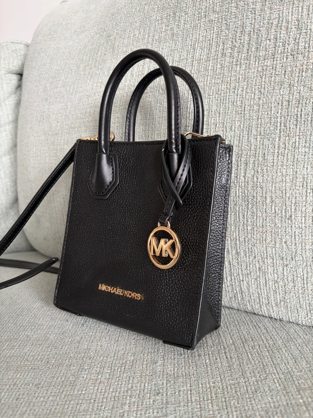 A small black leather handbag from Michael Kors. It features a pebbled texture and gold-tone hardware. Comes with a removable shoulder strap.