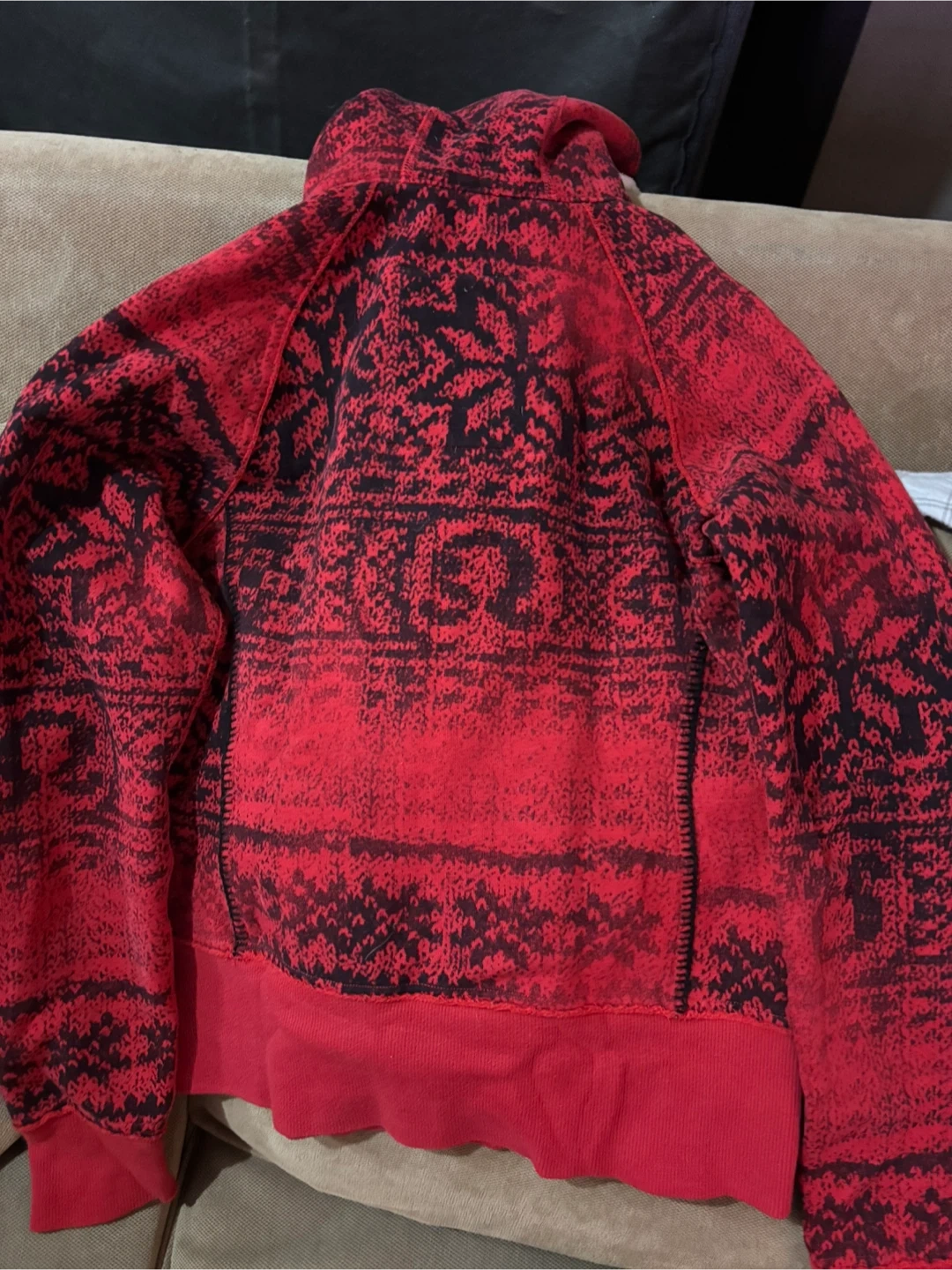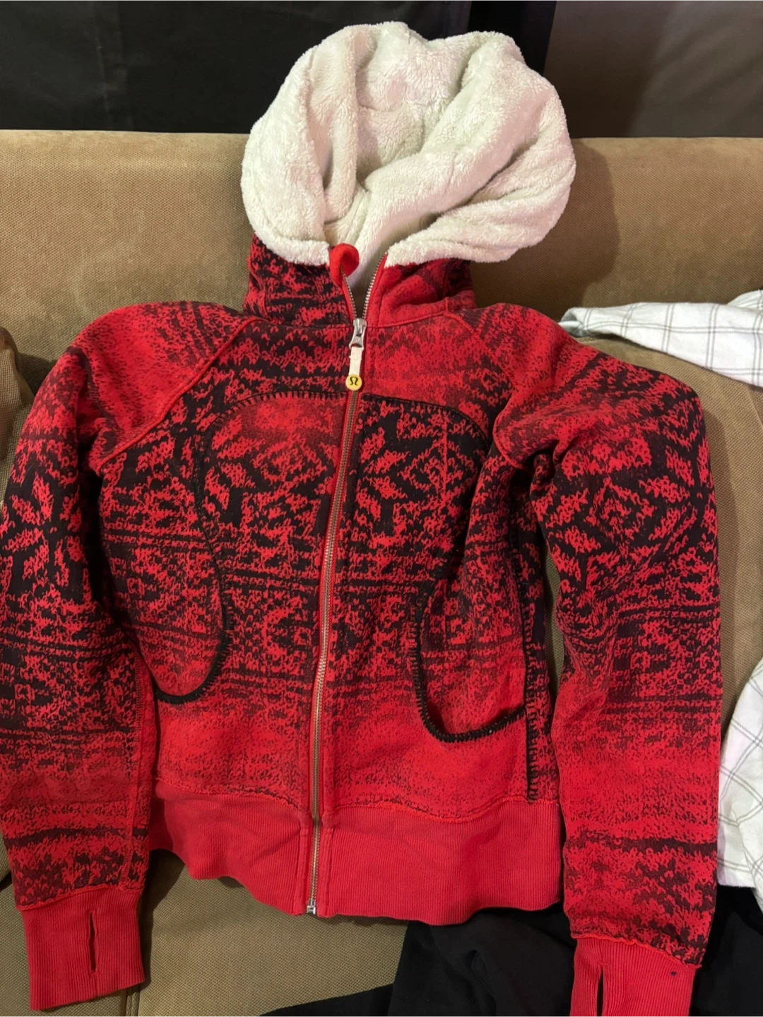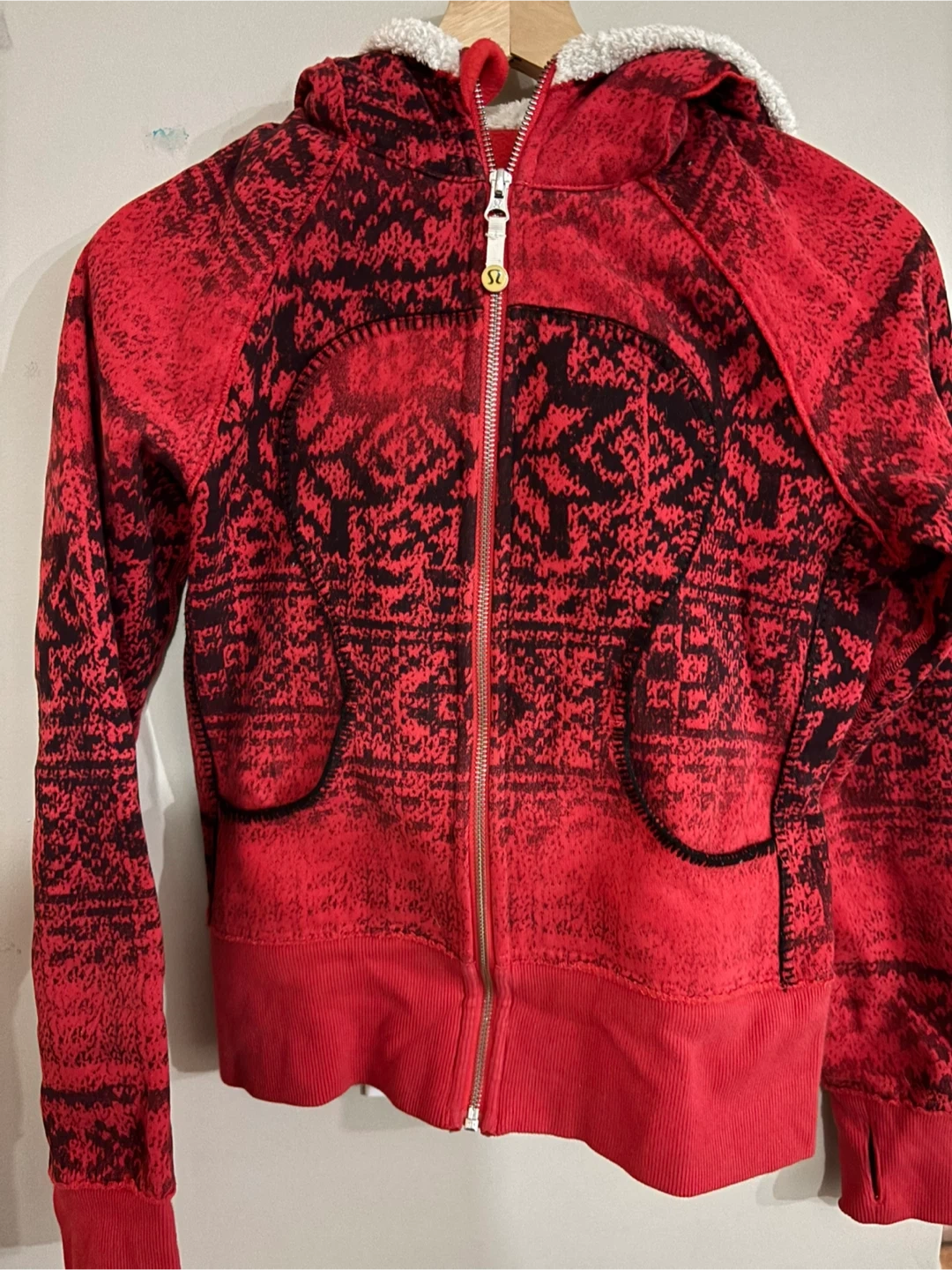 Selling a Lululemon Scuba Hoodie in a vibrant red and black pattern! It features a cozy, sherpa-lined hood and thumbholes for extra warmth. Perfect for chilly days or workouts!