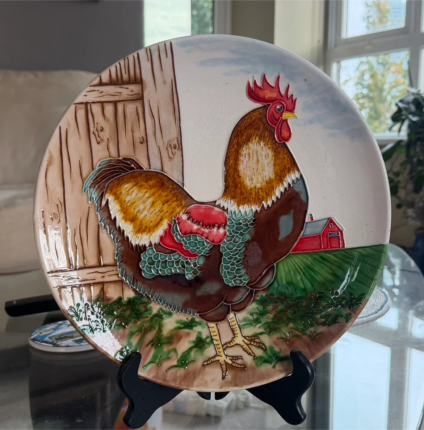 Selling a decorative plate featuring a rooster design. It's in great condition and would look lovely displayed in a kitchen or dining area