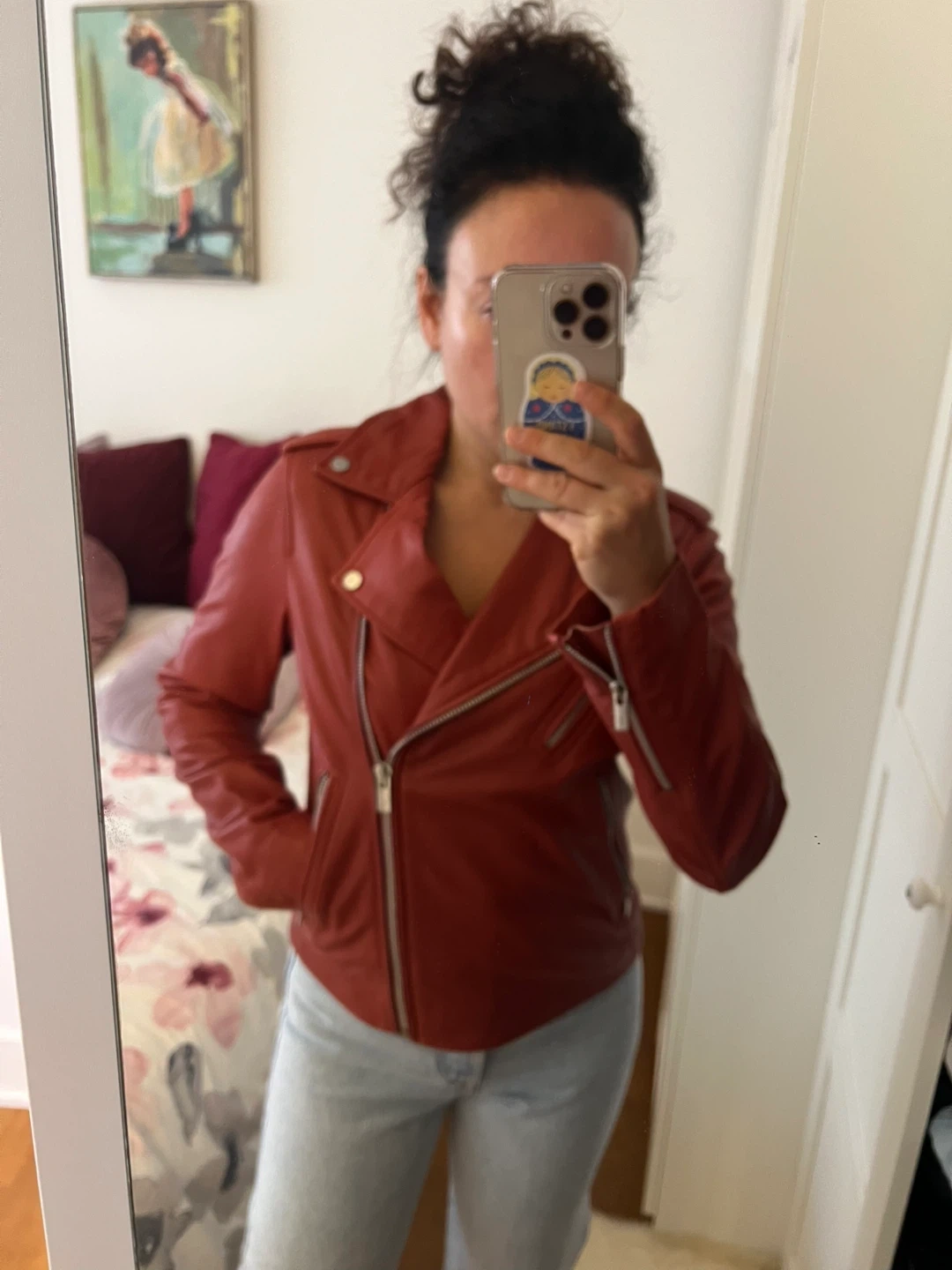 Here's a stylish MNG genuine leather biker jacket in size XS! It's in great condition and ready for a new home. Perfect for adding a touch of edgy flair to any outfit