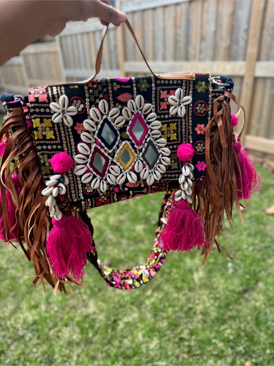 This unique boho-style bag features intricate embroidery, colourful tassels, and shell embellishments. It's made with a mix of fabric and leather accents. Great for adding a statement piece to any outfit!
