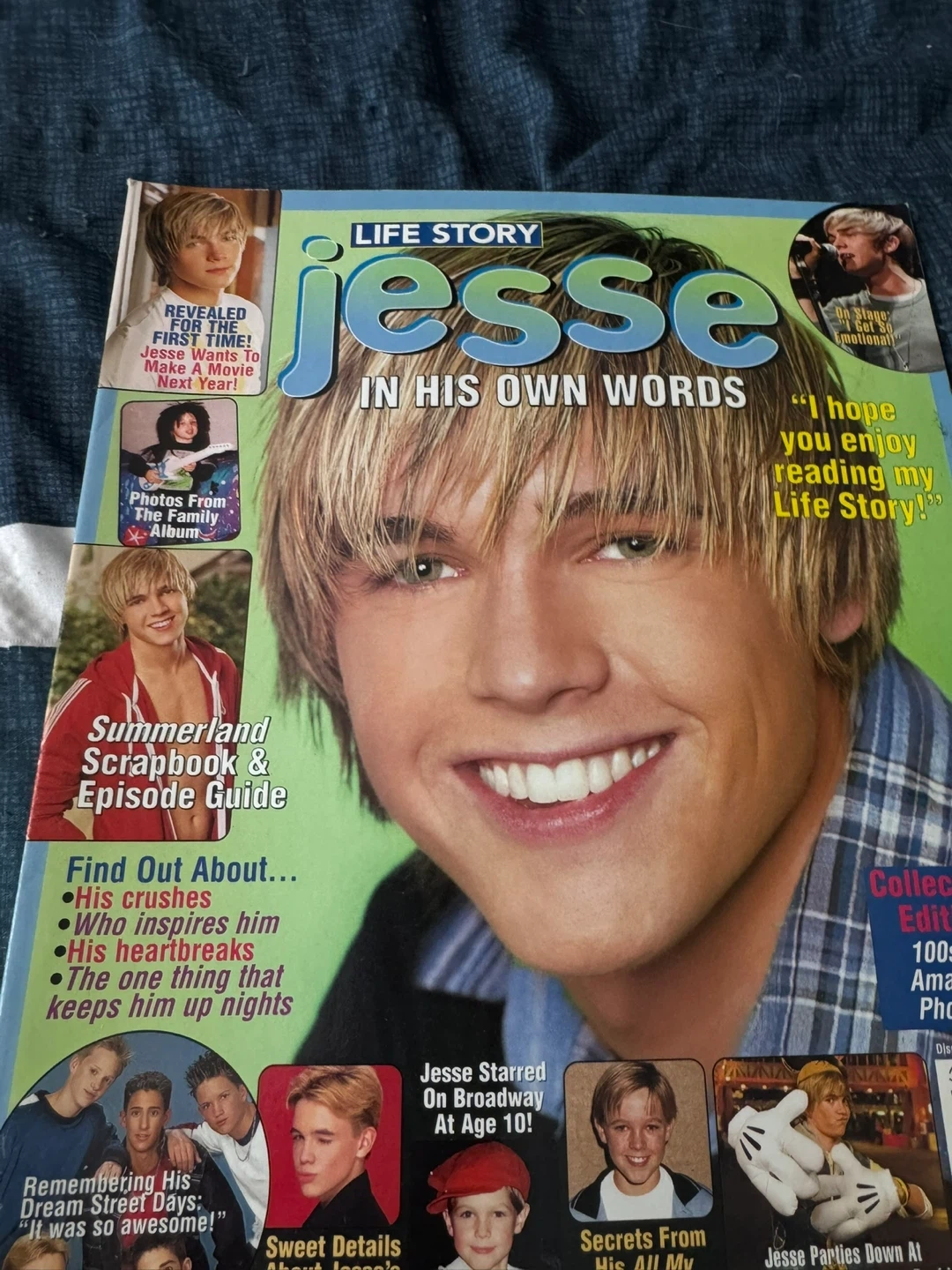 This is a LIFE STORY magazine featuring Jesse. It's a collectible keepsake edition. It includes his life story in his own words and photos from The Family Album. The magazine has details about his crushes, inspirations, heartbreaks, and the one thing that keeps him up at nights. It also covers his time on Broadway and his role on All My Children. Read only a few times. In amazing condition