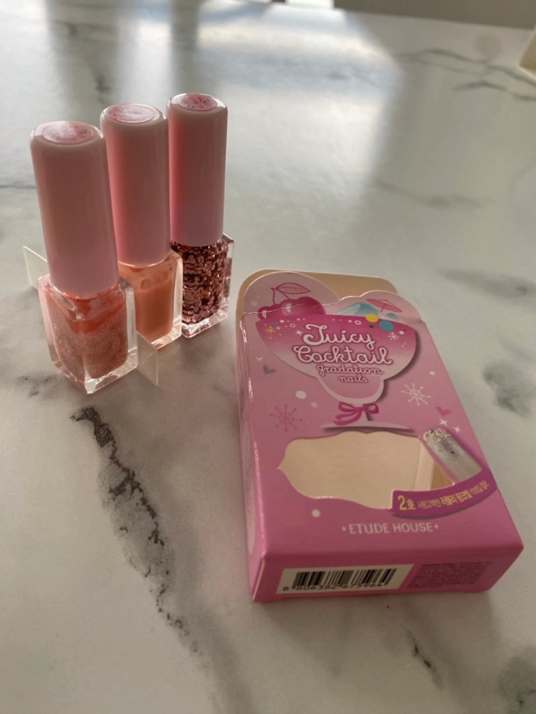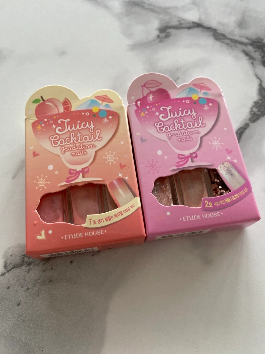 Two sets of ETUDE HOUSE Juicy Cocktail Gradation Nails. Peach Crush theme. Three mini nail polishes per set. New, unopened.