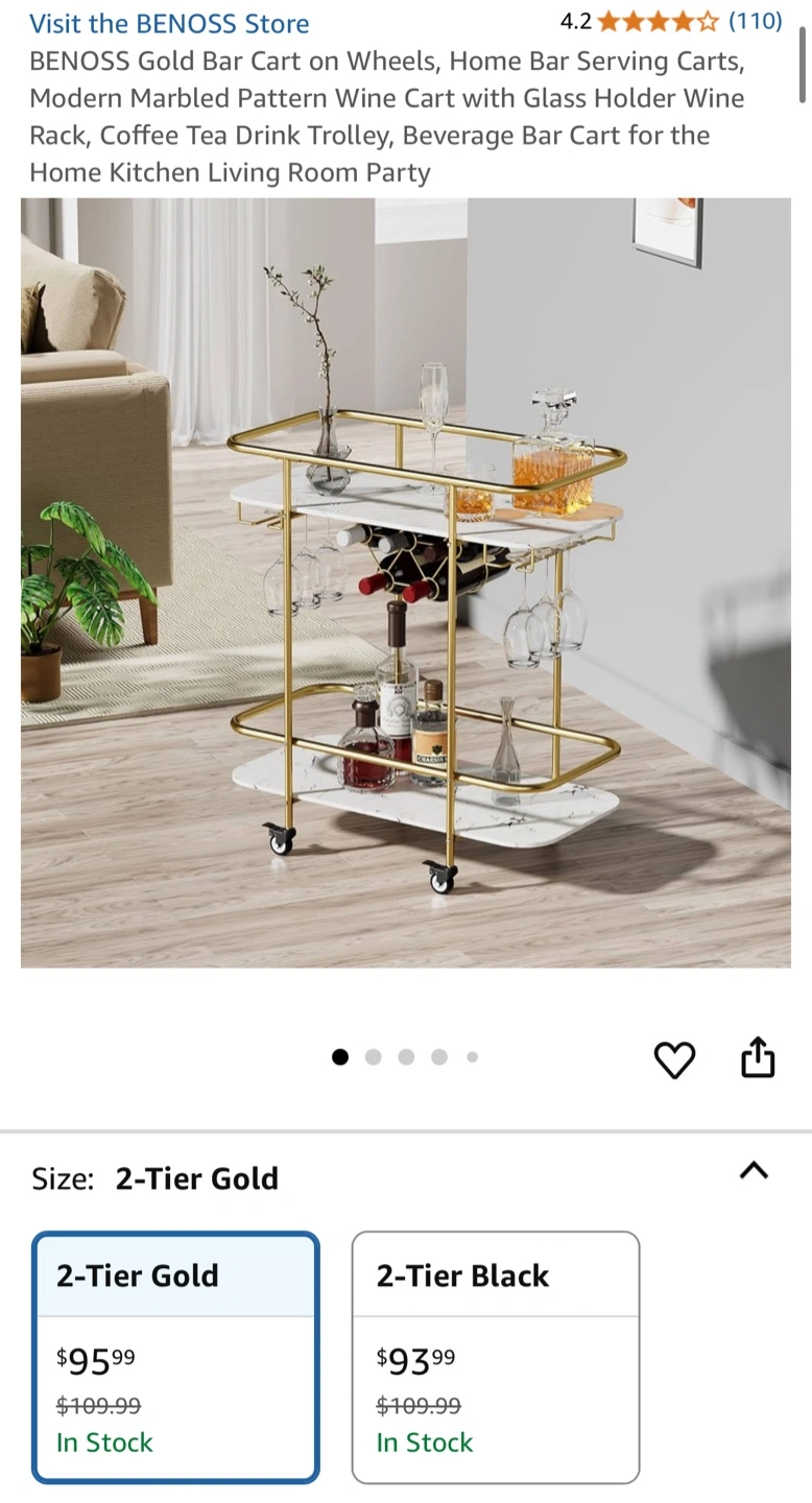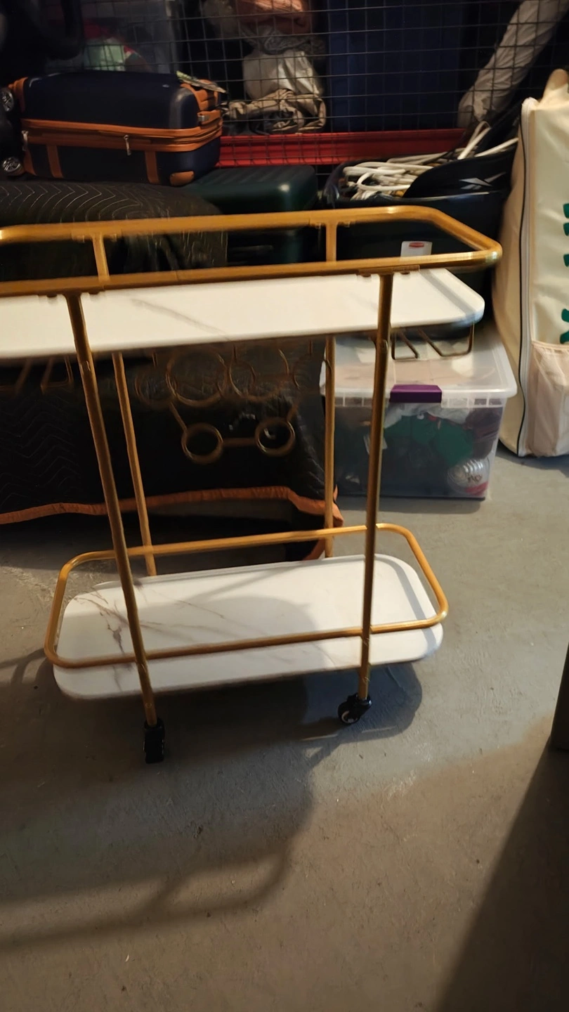 Selling a gently used BENOSS gold bar cart with two tiers. Originally bought for $96, only used for apartment staging. It's on wheels, making it easy to move around. The cart has a modern marble pattern and a glass holder.