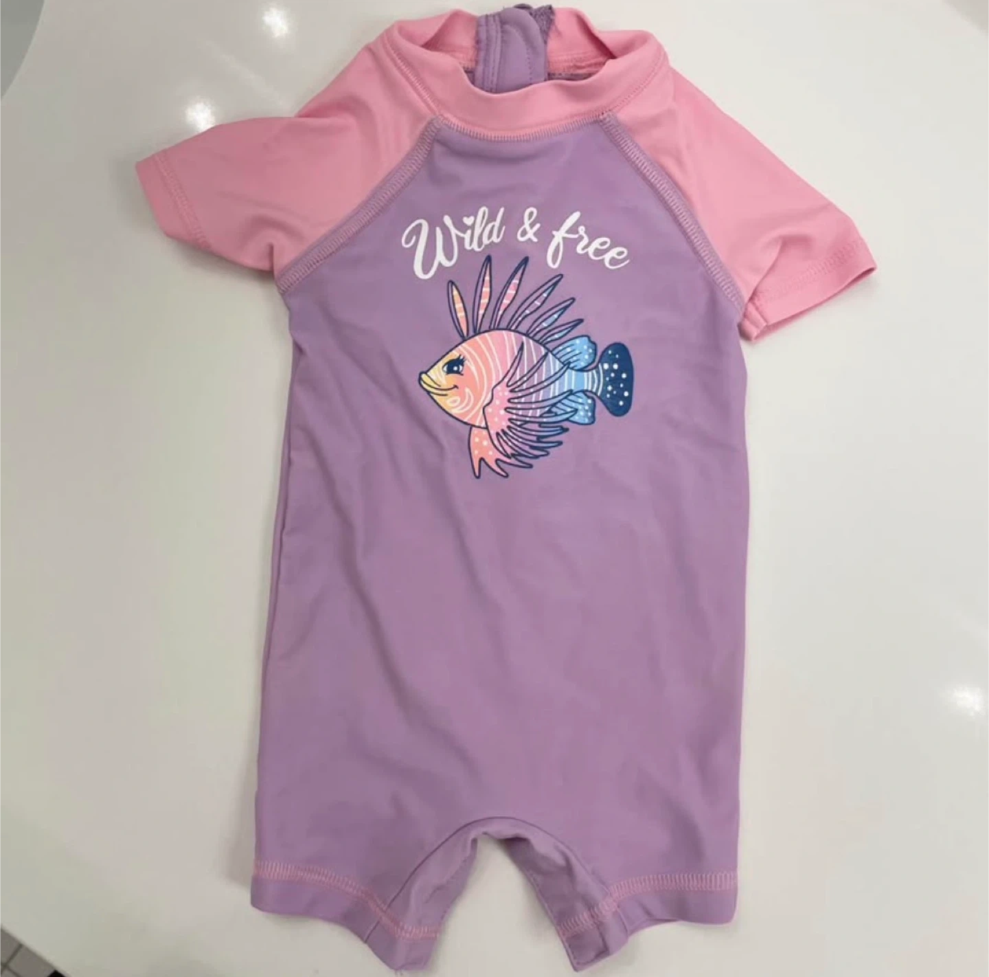 This adorable rash guard swimsuit is perfect for a day at the beach or pool! It features a fun fish graphic and the phrase 'Wild & free'. It's made with quick-drying fabric and has a full zipper in the back for easy on and off.