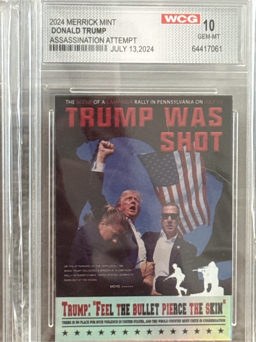 Selling a 2024 Merrick Mint Donald Trump Assassination Attempt commemorative item. It's graded GEM-MT 10 by WCG. The event depicted is from a campaign rally in Pennsylvania on July 13, 2024.