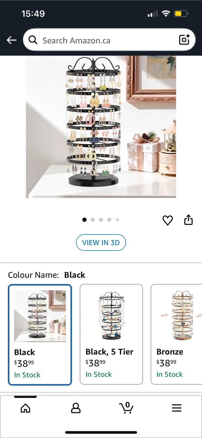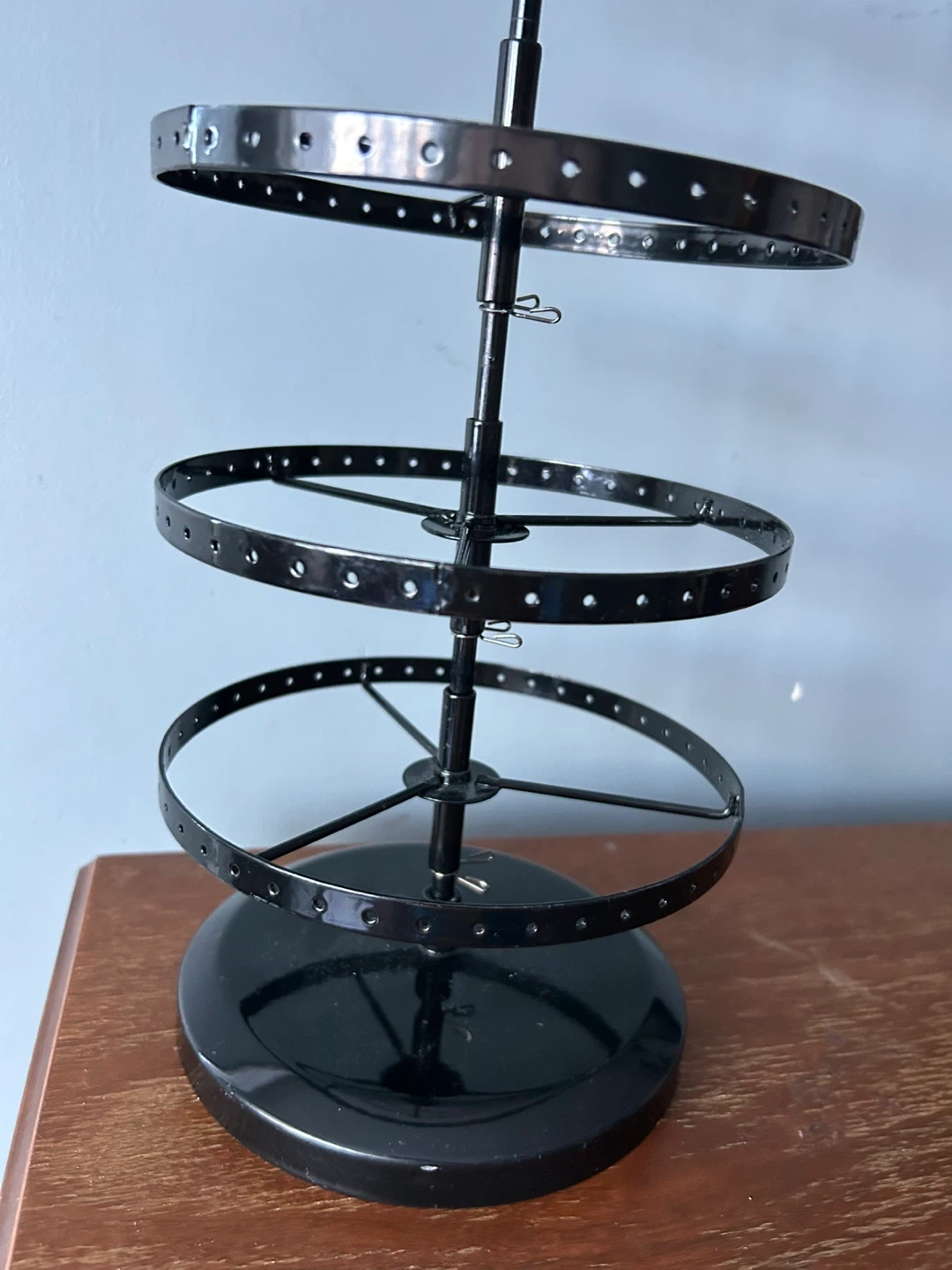 This black, 5-tier rotating jewelry organizer is perfect for displaying earrings. It's made of metal and offers plenty of space for your collection. Keeps your jewellery neatly organized and easily accessible! Originally $40, selling for $25
