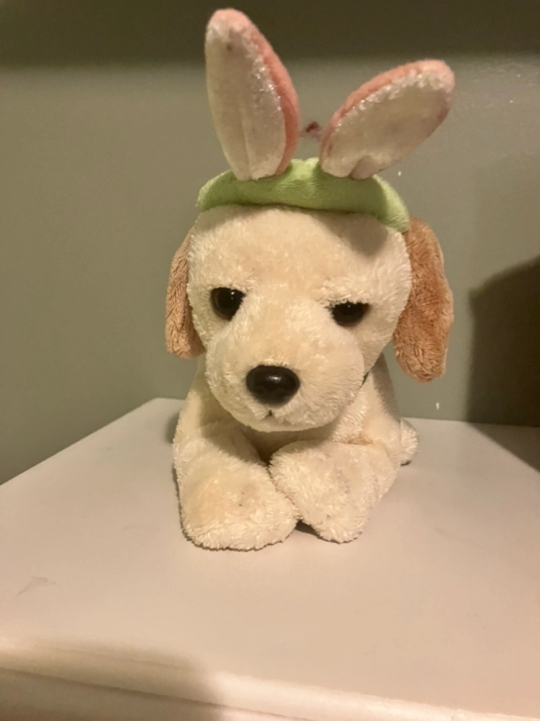 Cute plush puppy toy wearing a bunny hat. Perfect Easter gift or decoration. Soft and cuddly. Features pastel colours and floral accents.
