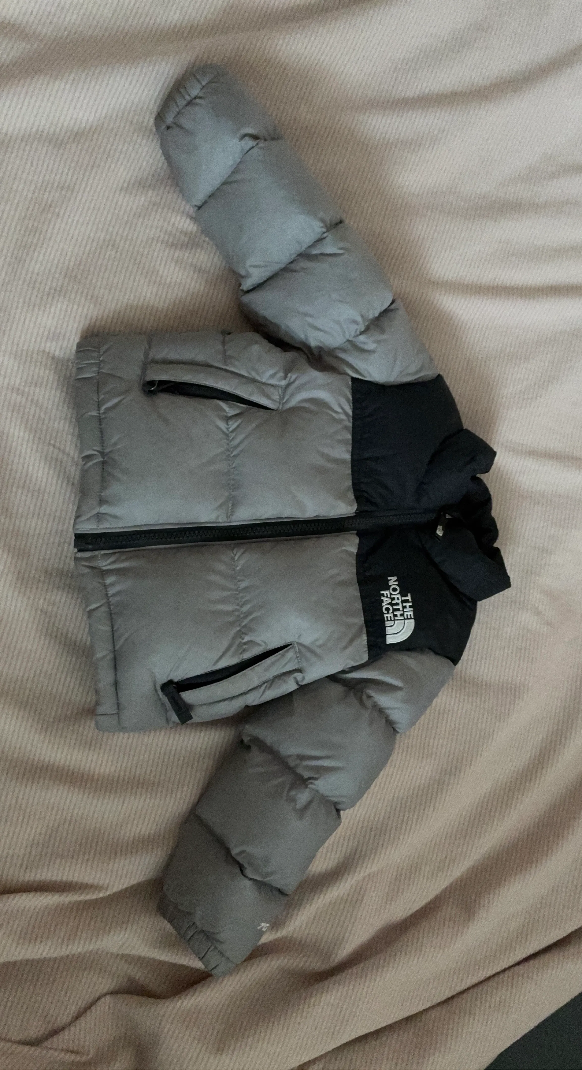 This is a grey and black puffer jacket from The North Face. It features zippered pockets and a full-zip front. It's a stylish and warm option for cooler weather.