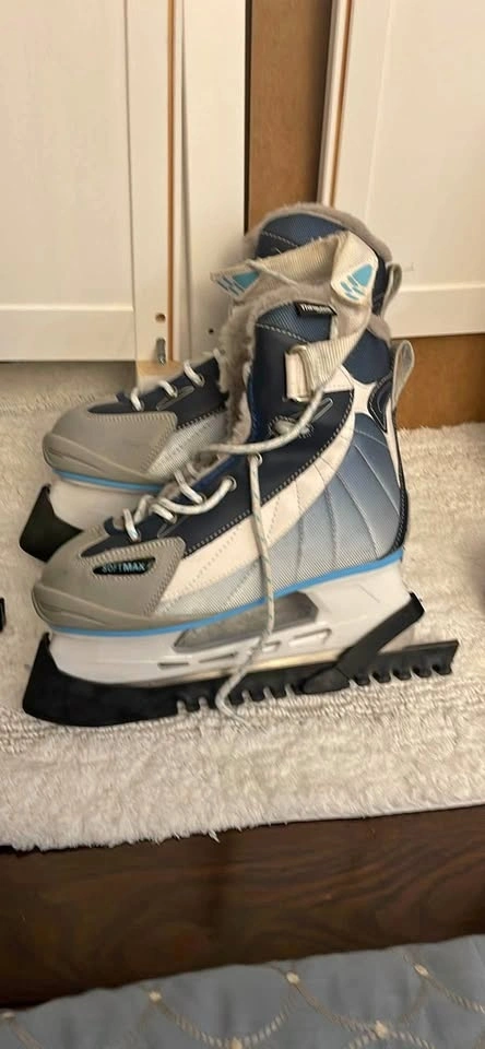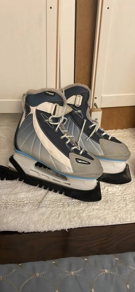 Warm SOFTMAX ice skates with Thinsulate insulation. Size US 5, EU 36, UK 4. Blue, grey, and white colors. Comes with blade guards. Pick up only near Eglinton & Yonge (7 Broadway).