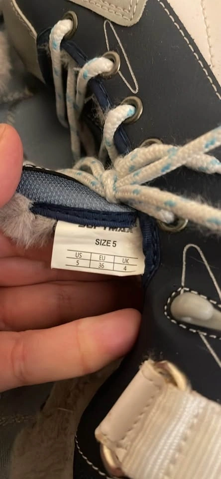 Warm SOFTMAX ice skates with Thinsulate insulation. Size US 5, EU 36, UK 4. Blue, grey, and white colors. Comes with blade guards. Pick up only near Eglinton & Yonge (7 Broadway).