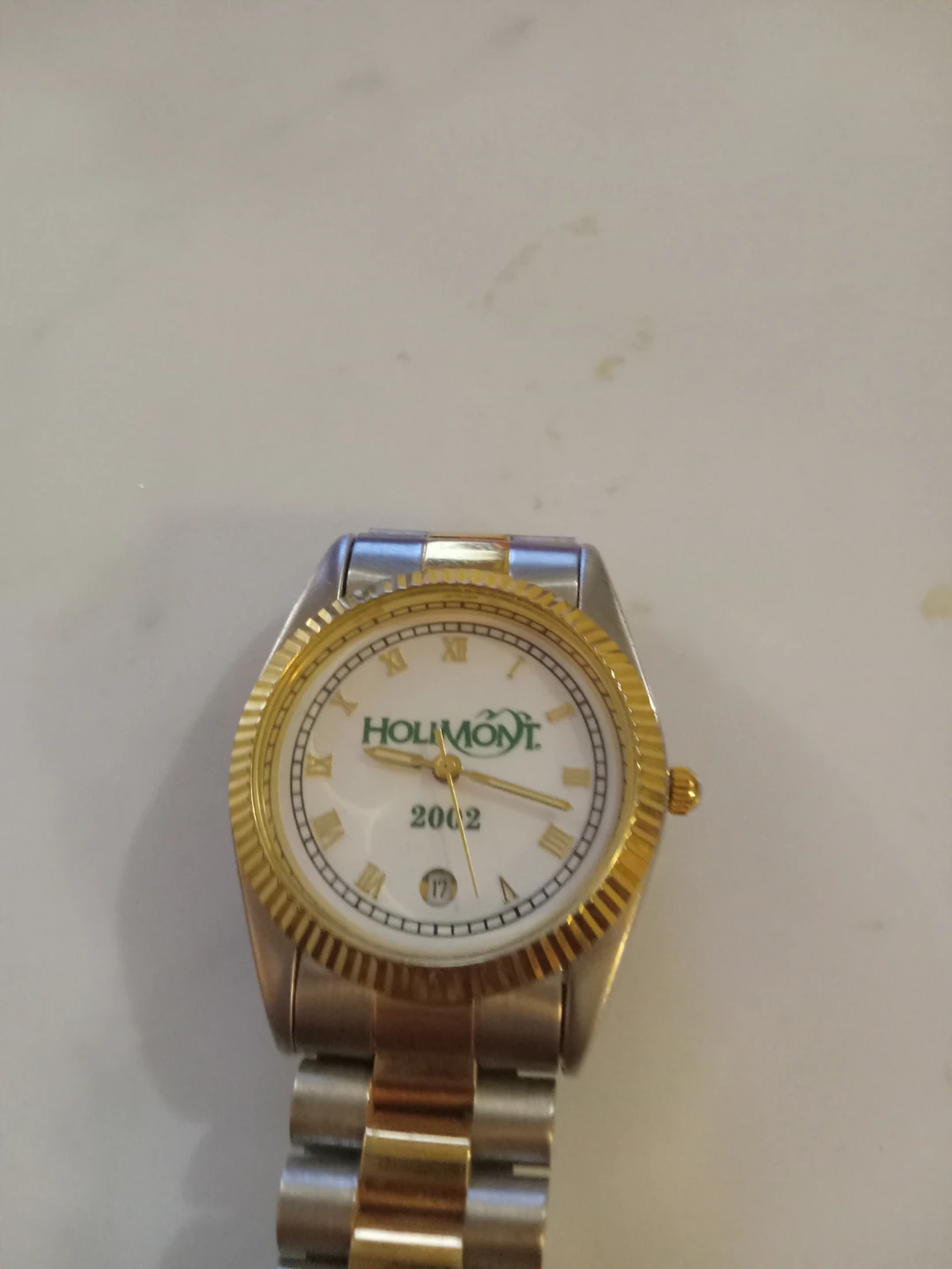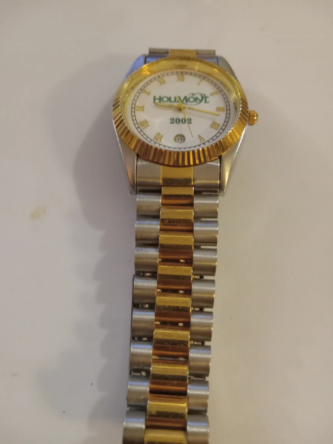 This is a Holimont watch with a white face and Roman numerals. It has a date display at the 6 o'clock position. The watchband is a two-tone silver and gold style. It's a nice accessory for any occasion!