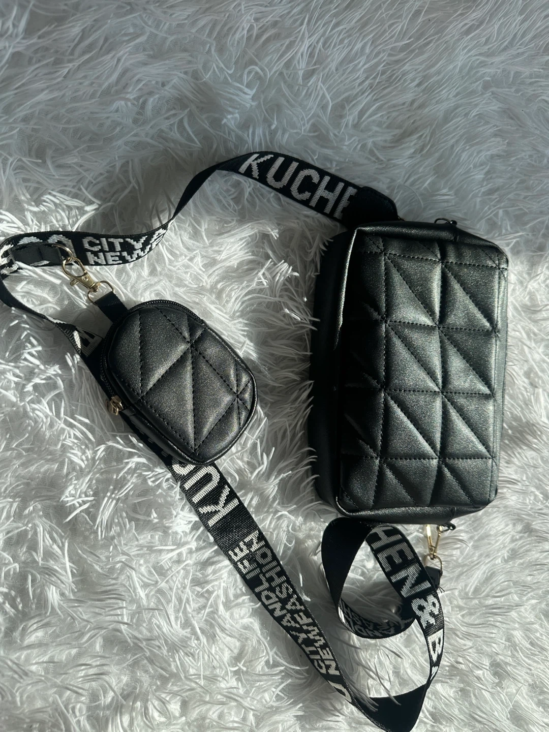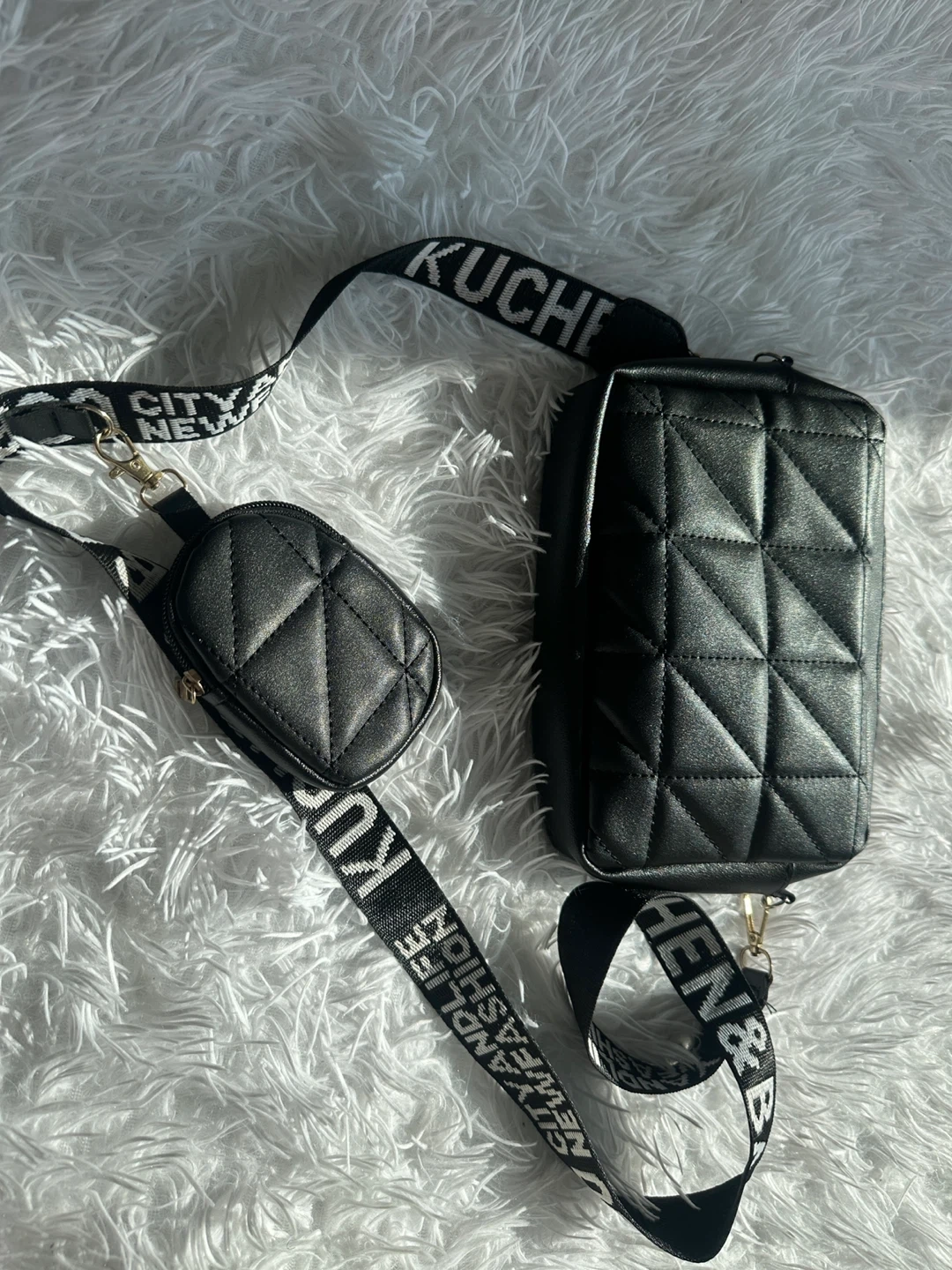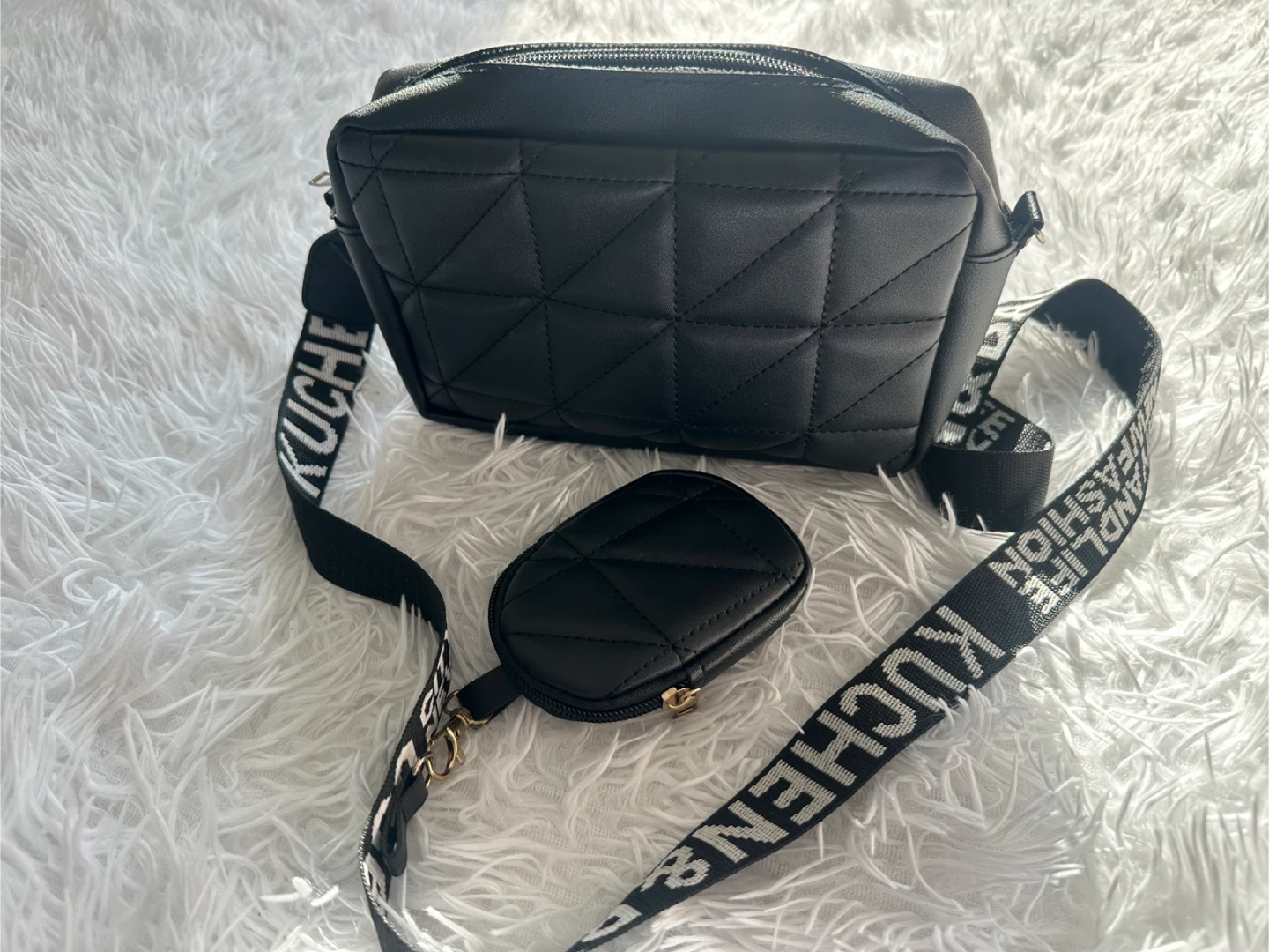 A stylish black crossbody bag with a quilted design. It comes with a matching coin pouch attached to the strap. The strap is adjustable and features repeating text.