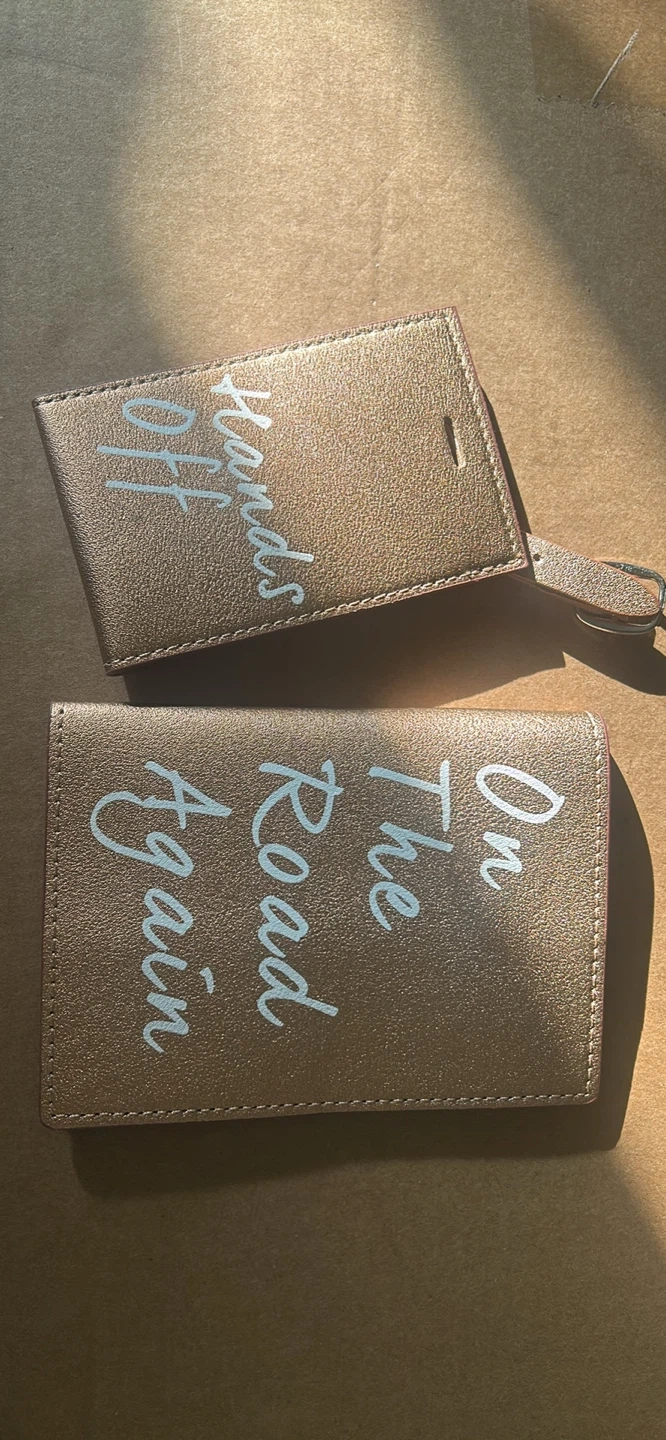 This set includes a passport holder and a matching luggage tag. Both pieces are a rose gold colour with white text. The passport holder reads 'On The Road Again' and the luggage tag reads 'Hands Off'. It's a great way to keep your travel documents organised and visible!