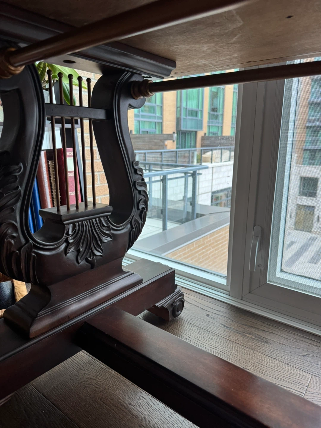 Dark walnut writing Table with Ornate Lyre Pedestals