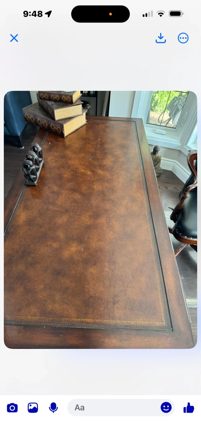 Beautiful dark walnut writing desk featuring ornate legs and a leather inlay top. Three drawers. This unusual desk provides a grand statement piece for any room or office.