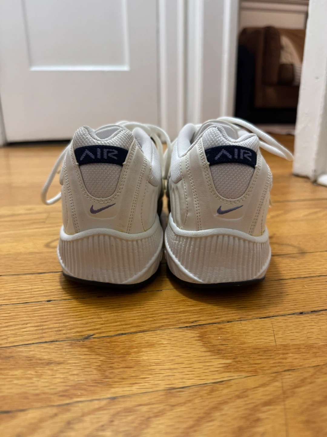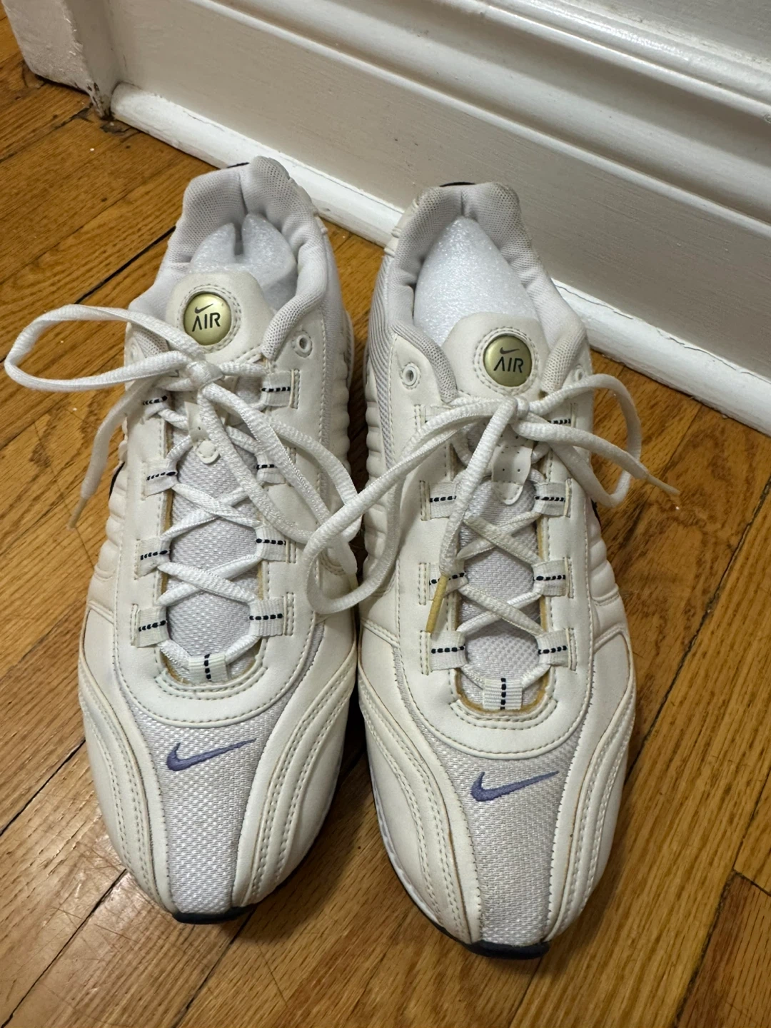 These are a pair of white Nike Air sneakers. They feature a lace-up closure and the iconic lilac Nike swoosh. Perfect for casual wear or athletic activities.