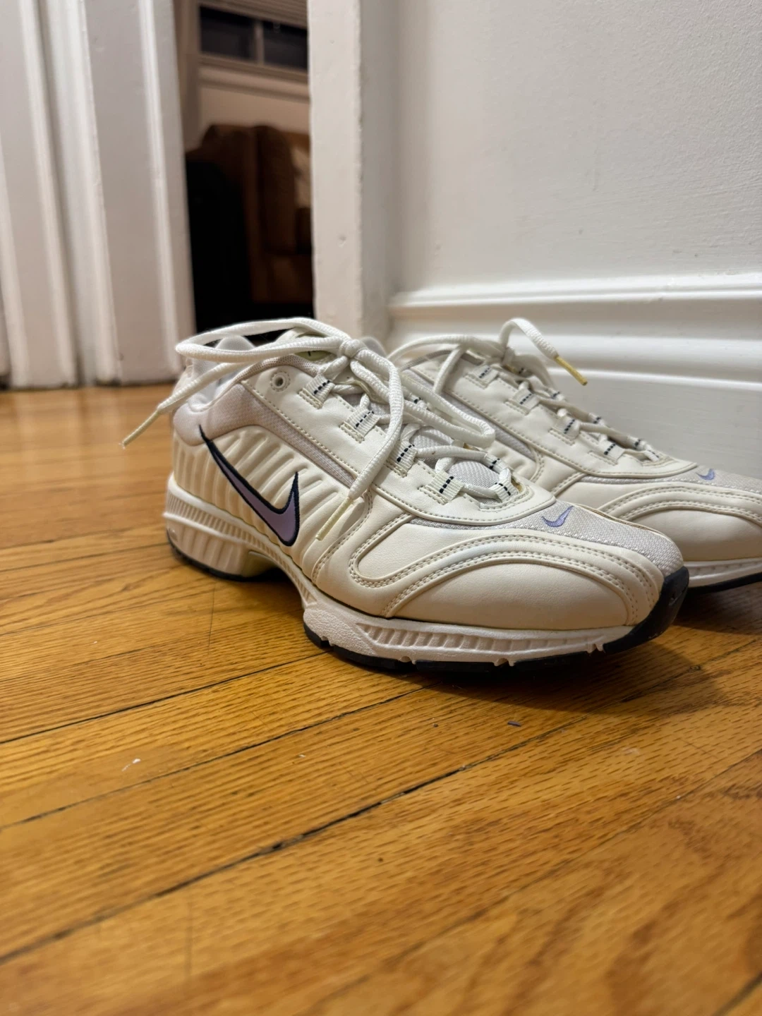These are a pair of white Nike Air sneakers. They feature a lace-up closure and the iconic lilac Nike swoosh. Perfect for casual wear or athletic activities.