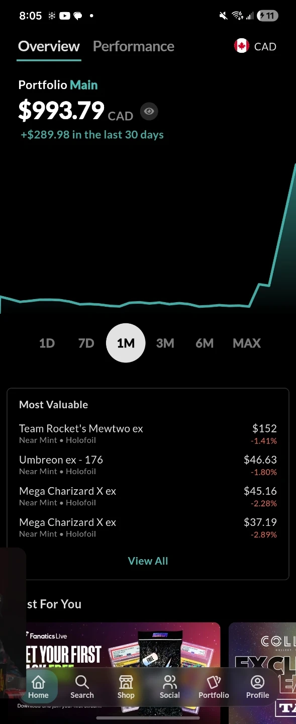 This is a digital portfolio of Pokémon cards. It lists cards like Team Rocket's Mewtwo ex, Umbreon ex - 176, and Mega Charizard X ex. Cards are listed as Mint and Holofoil.