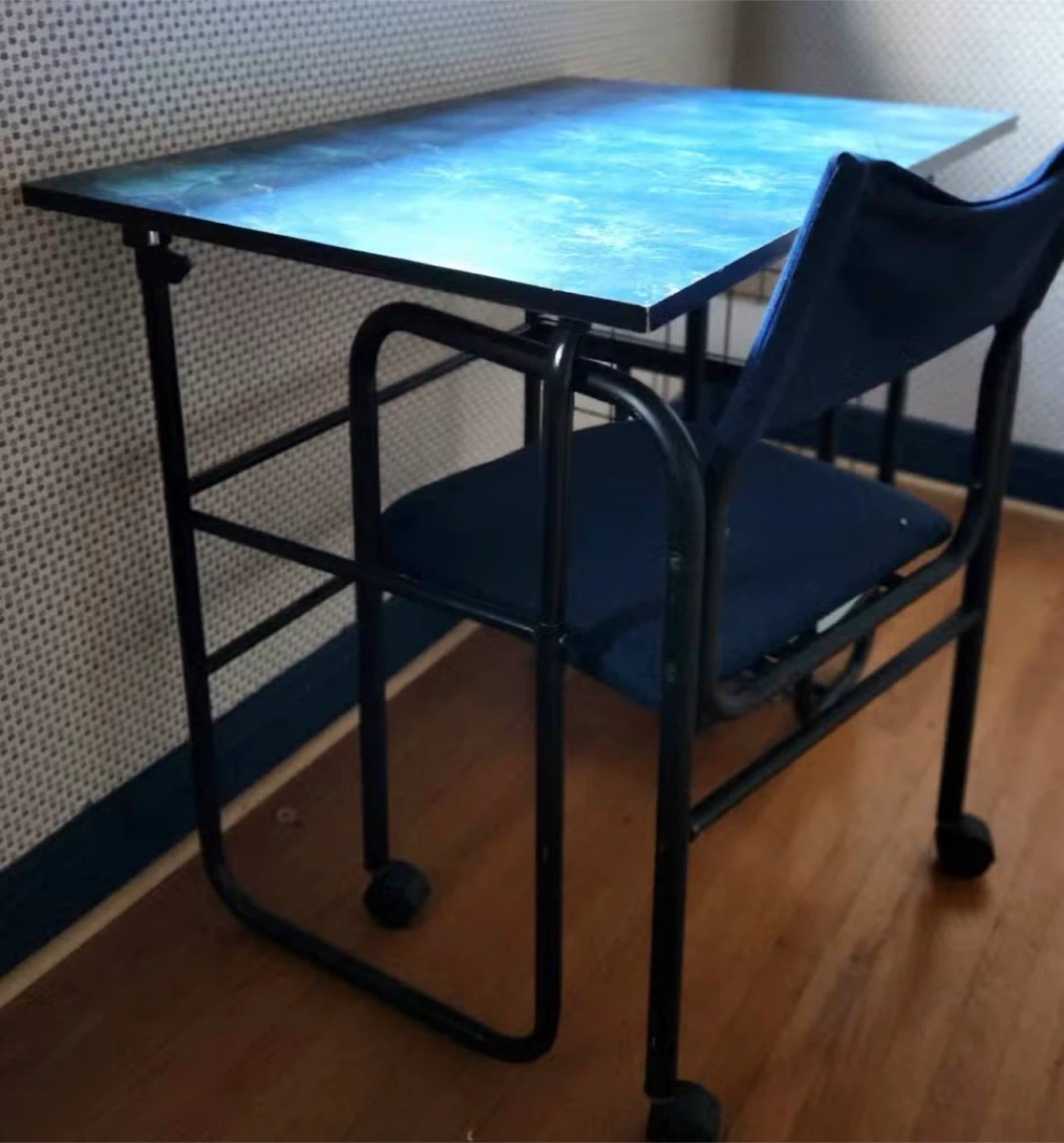 This desk features a cool blue swirl design on its tabletop. It comes with a matching navy blue chair that tucks neatly underneath. The desk and chair have black metal frames, and the desk has wheels for easy moving. Perfect for a study area or small office space!