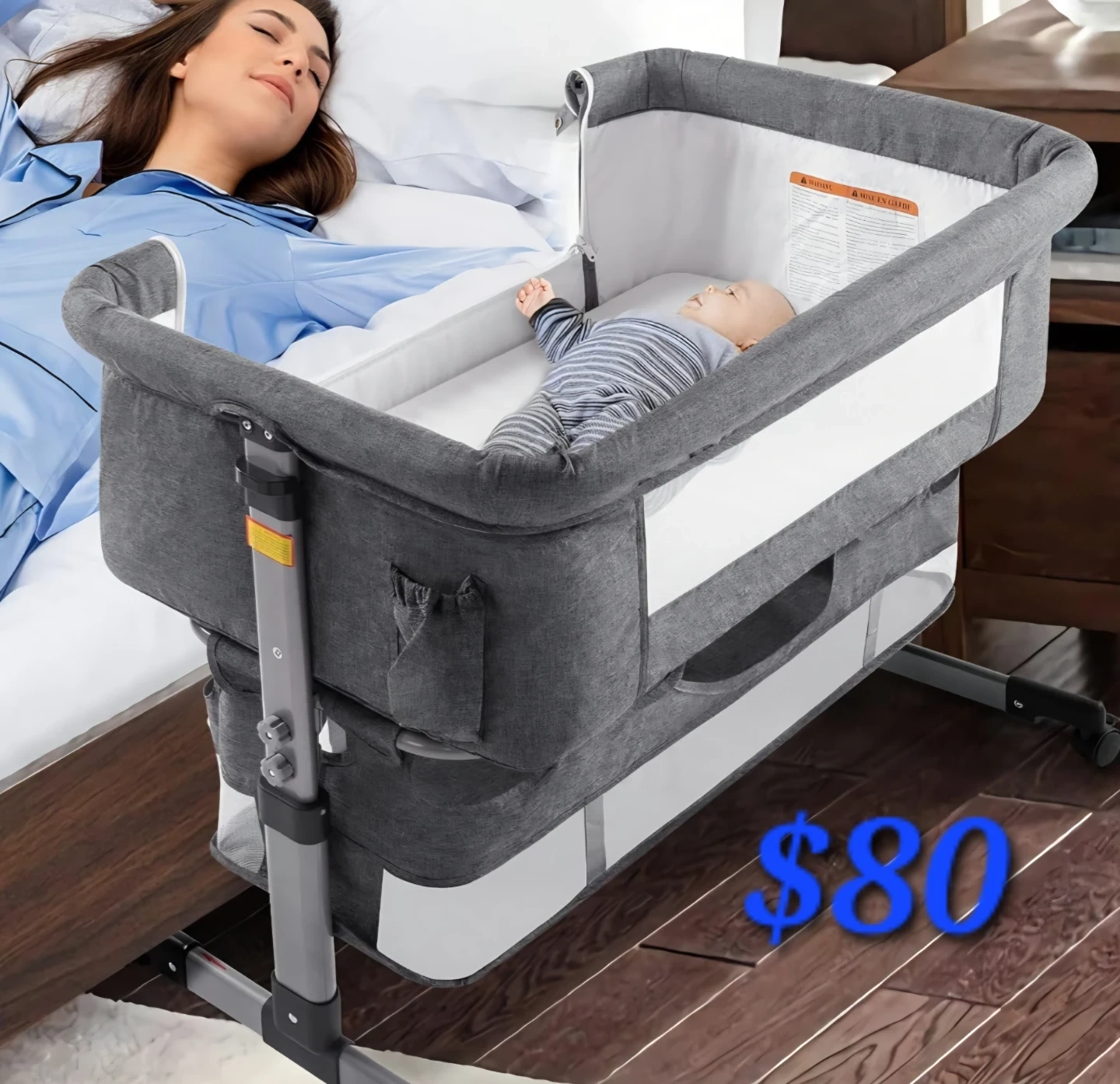 This is a grey bassinet designed for newborns to sleep next to a bed. It features a bedside design for easy access. Includes storage pockets on the side.