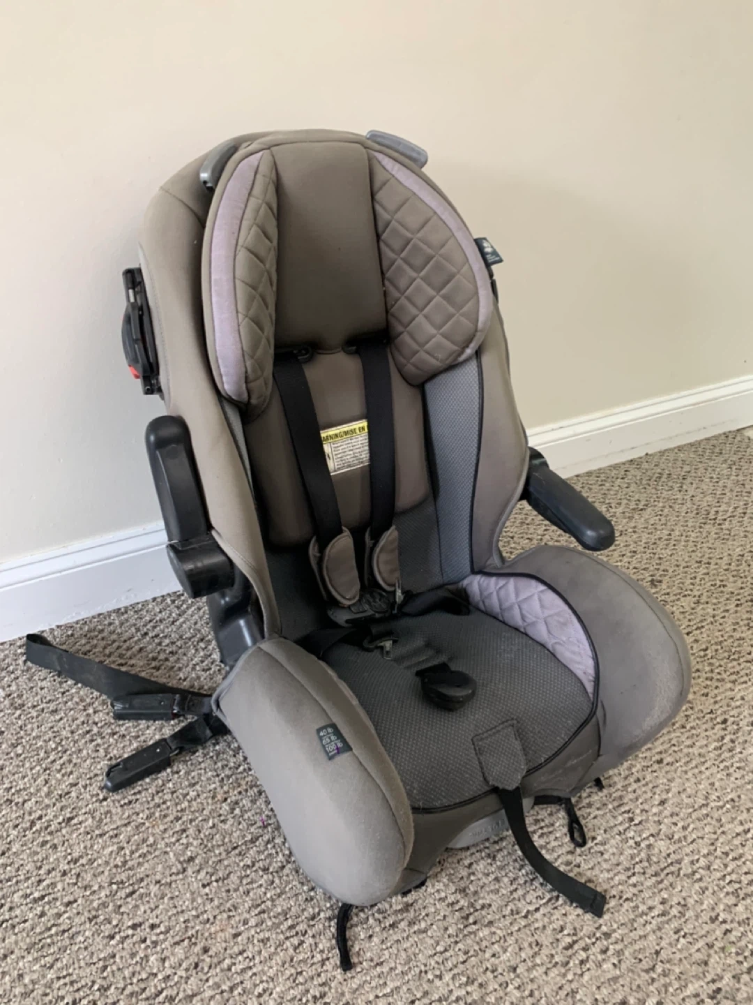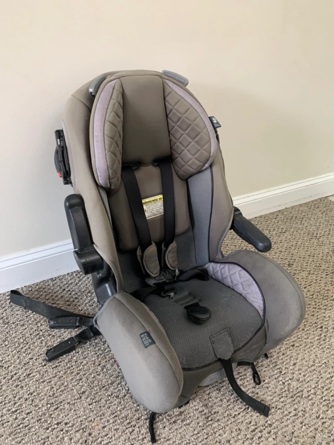 This is a grey car seat with a 5-point harness. It has padded head support and adjustable straps. It's designed for safety and comfort on the road.