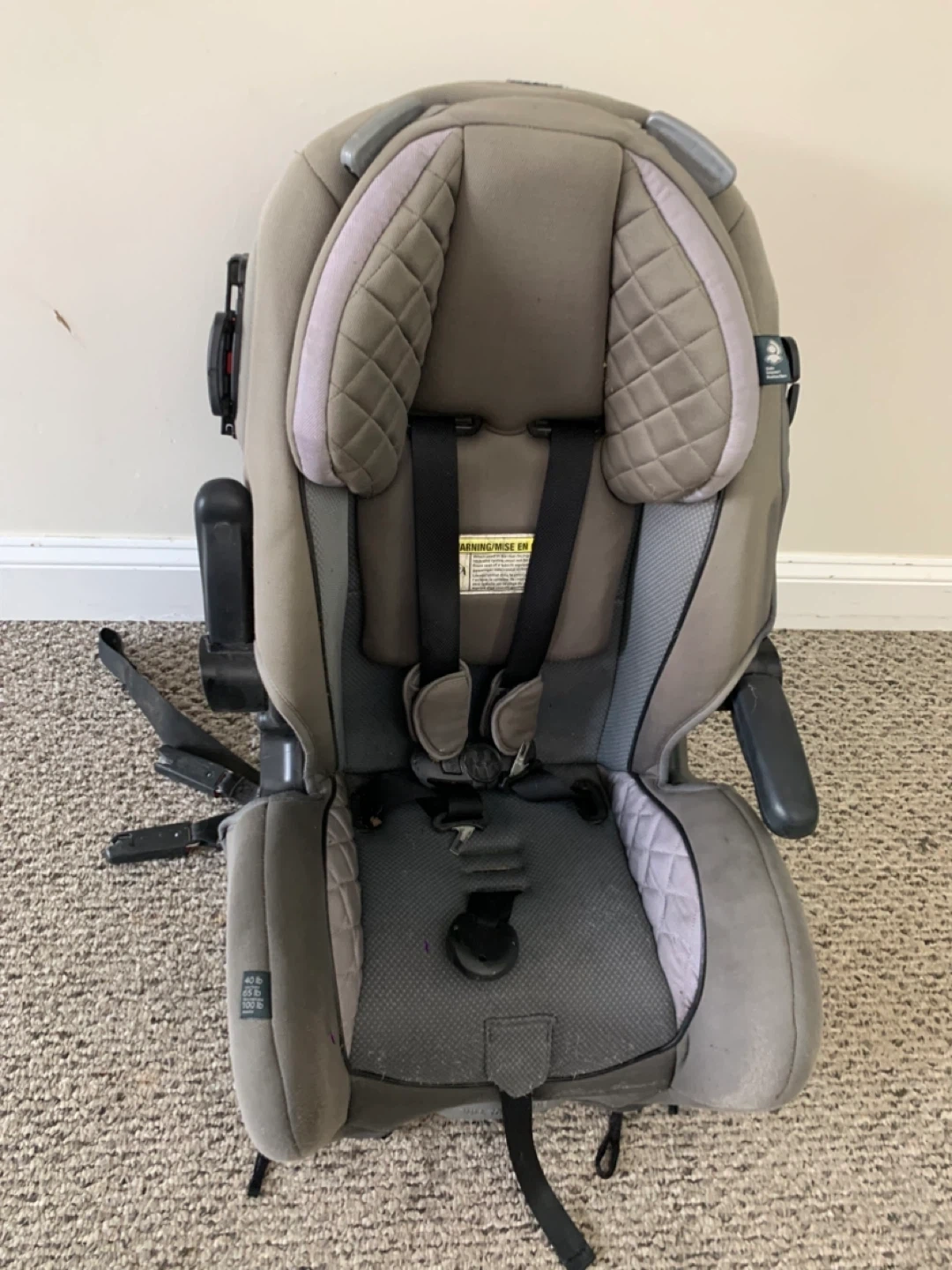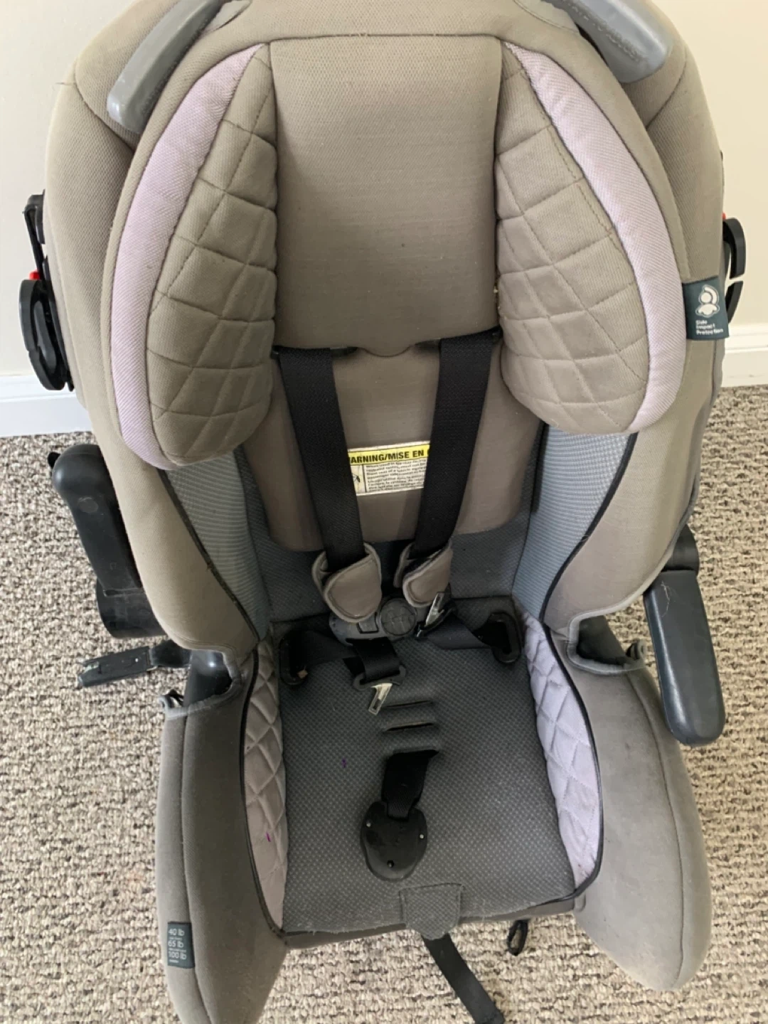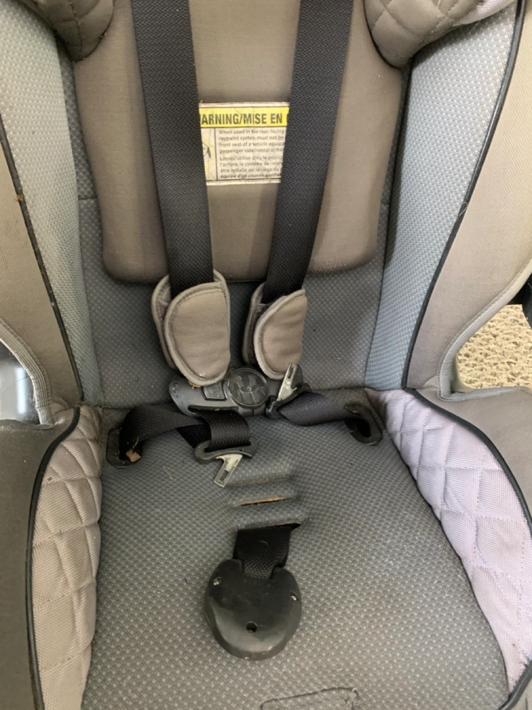 This is a grey car seat with a 5-point harness. It has padded head support and adjustable straps. It's designed for safety and comfort on the road.