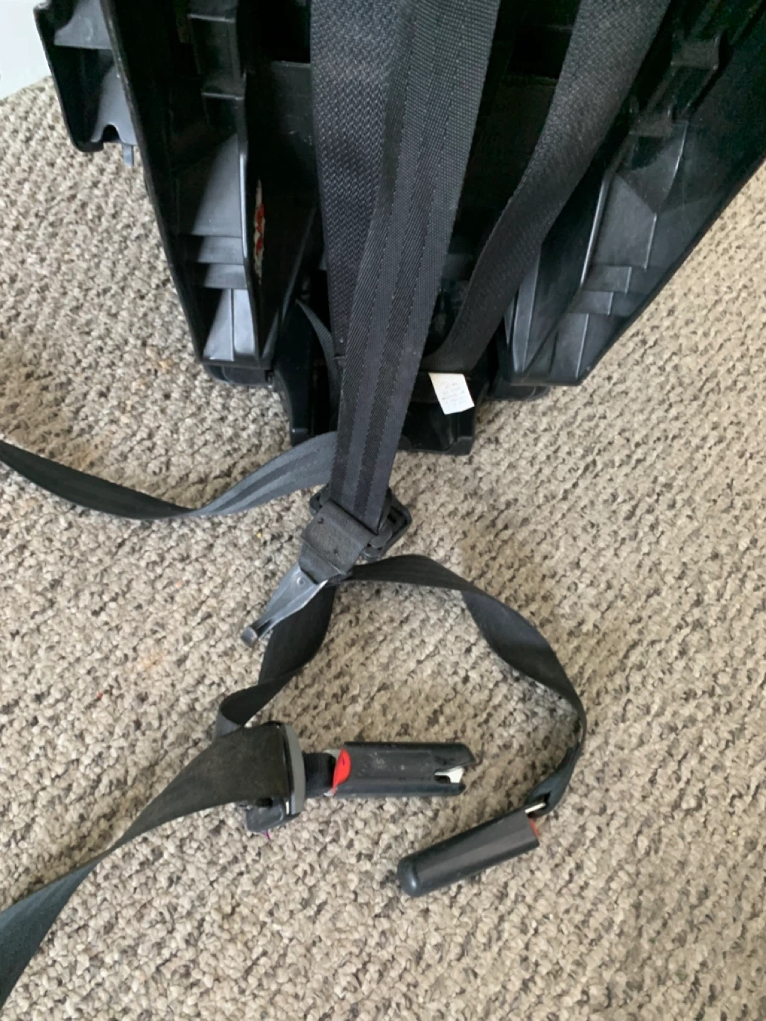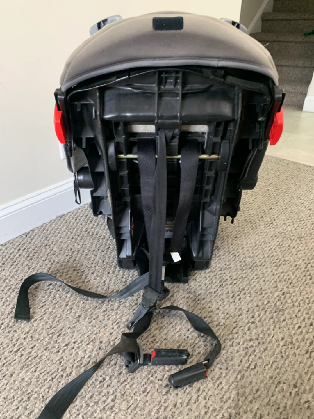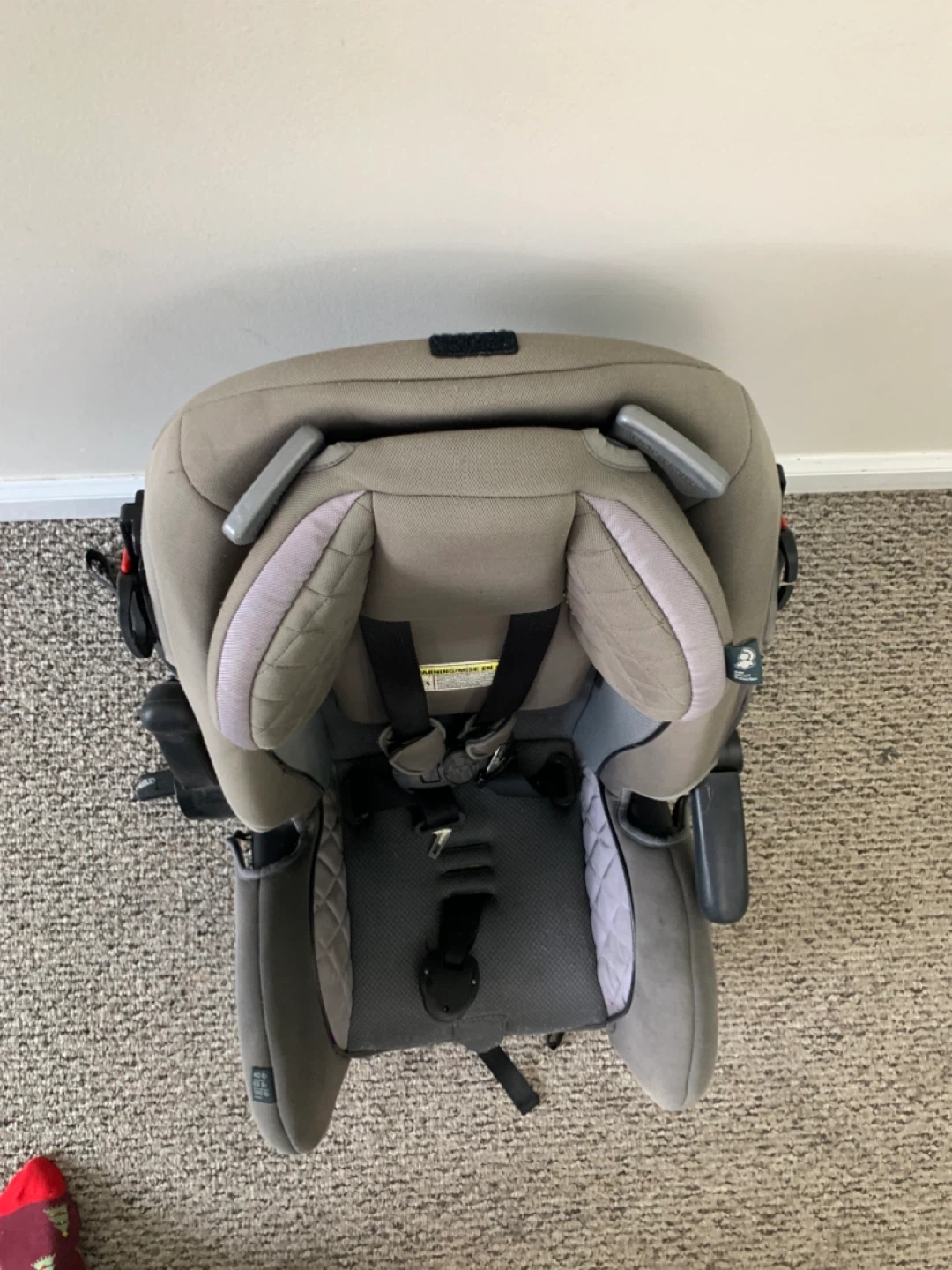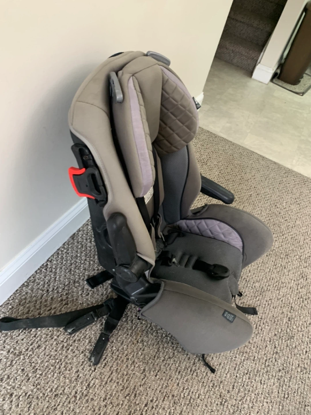 This is a grey car seat with a 5-point harness. It has padded head support and adjustable straps. It's designed for safety and comfort on the road.