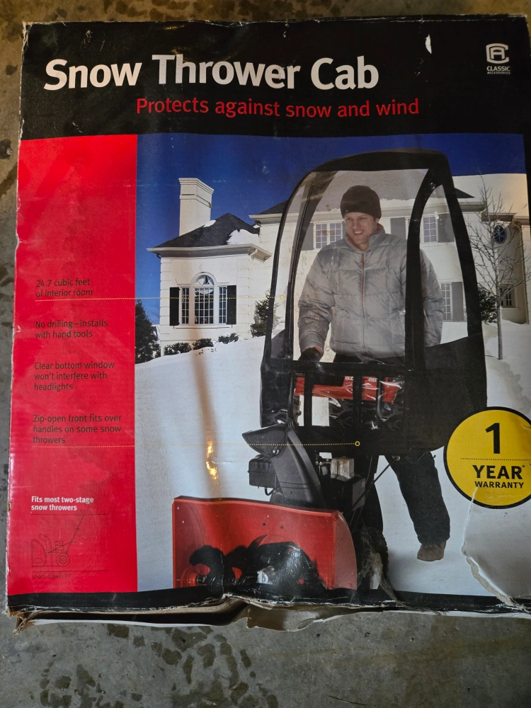 Protects against snow and wind. 24.7 cubic feet of interior room. No drilling - installs with hand tools. Clear bottom window won't interfere with headlights. Zip-open front fits over handles on some snow throwers. Fits most two-stage snow throwers.