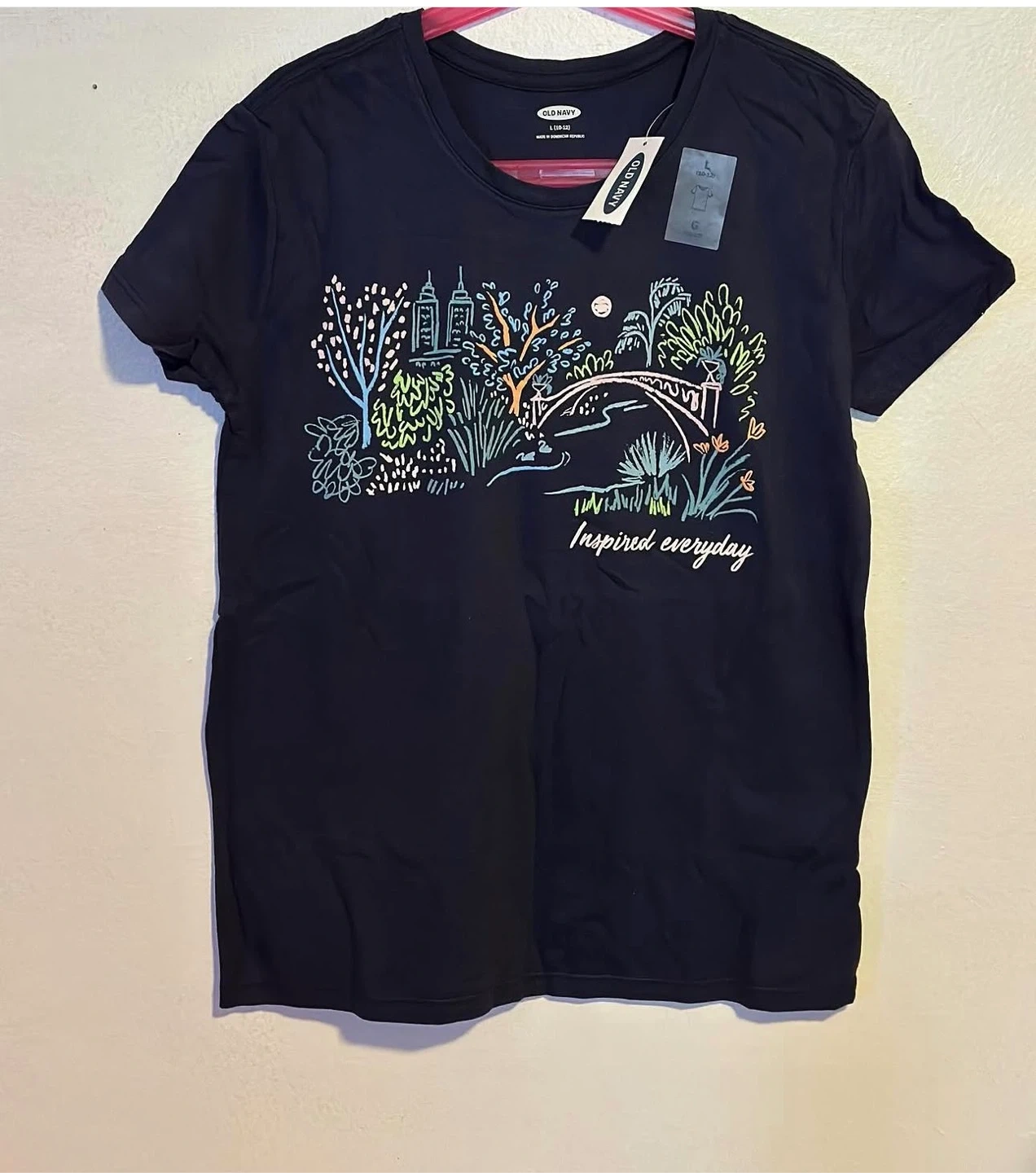 Old Navy black t-shirt with a colourful graphic print of a bridge, trees, and buildings. The text "Inspired everyday" is printed on the front. Size L (10-12).