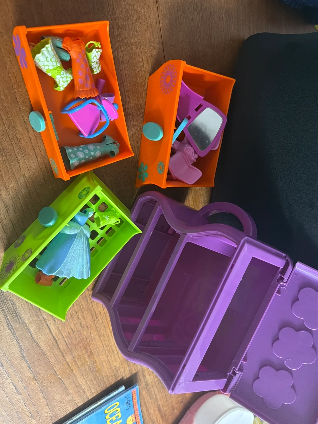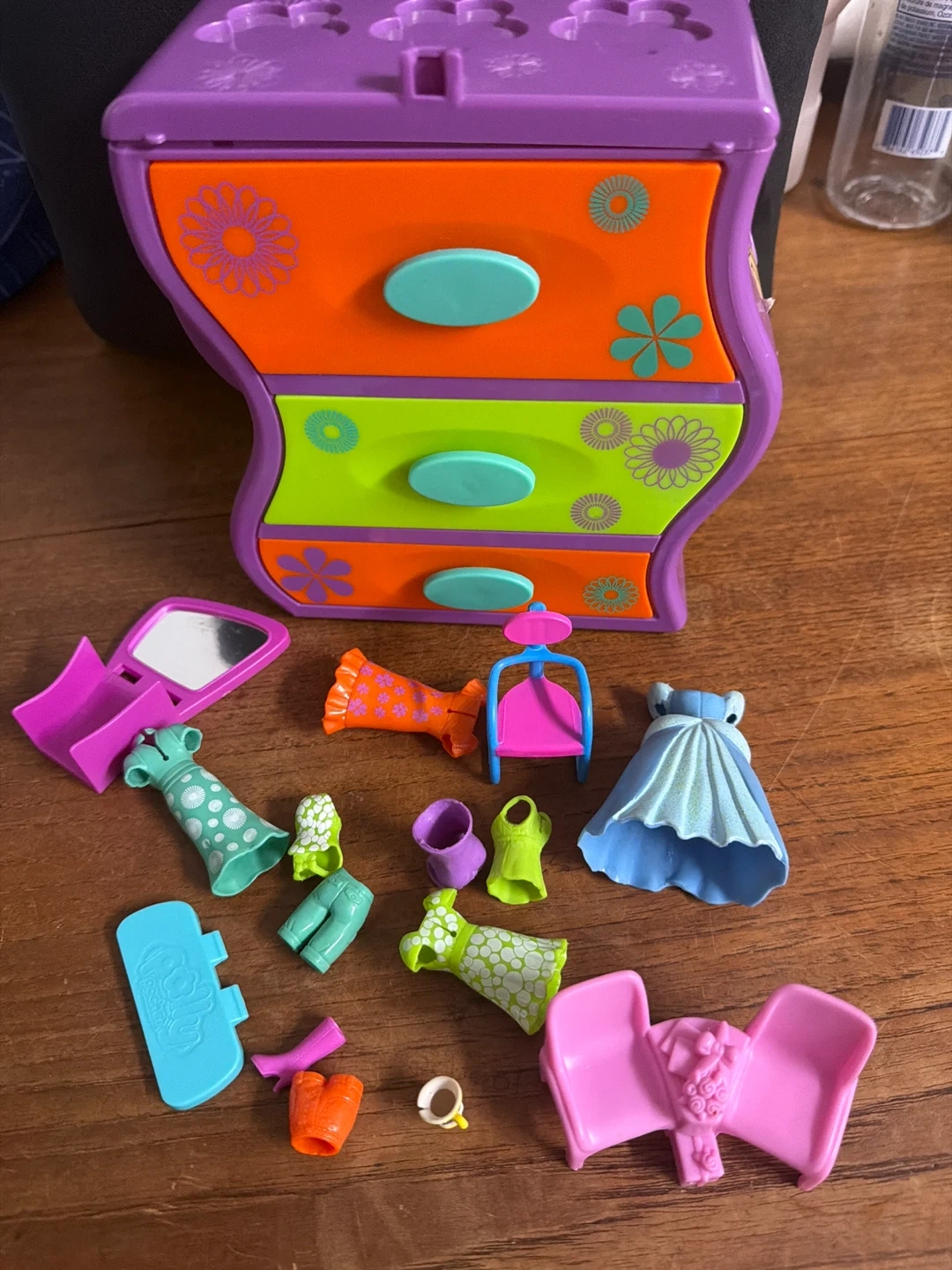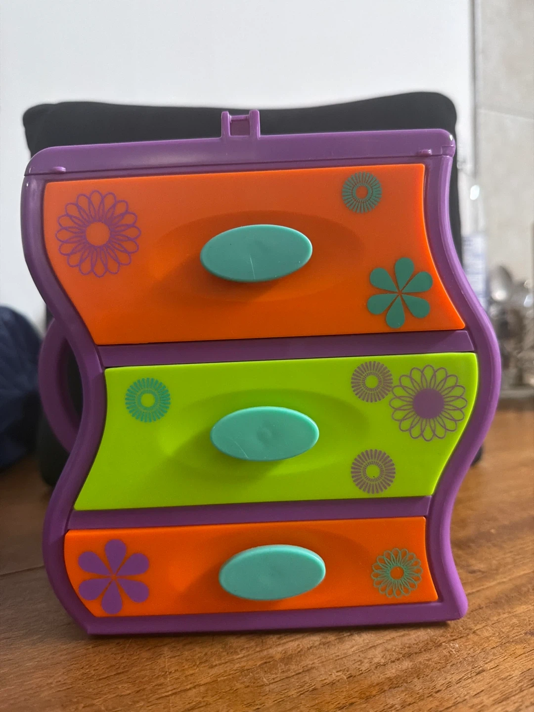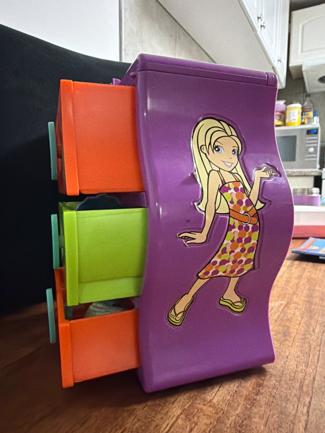 This is a fun, colourful 3-drawer mini chest from Polly Pocket. It's perfect for storing small trinkets or accessories. The drawers are orange and lime green with teal pulls. It's purple on the outside and features a graphic of a girl on one side.