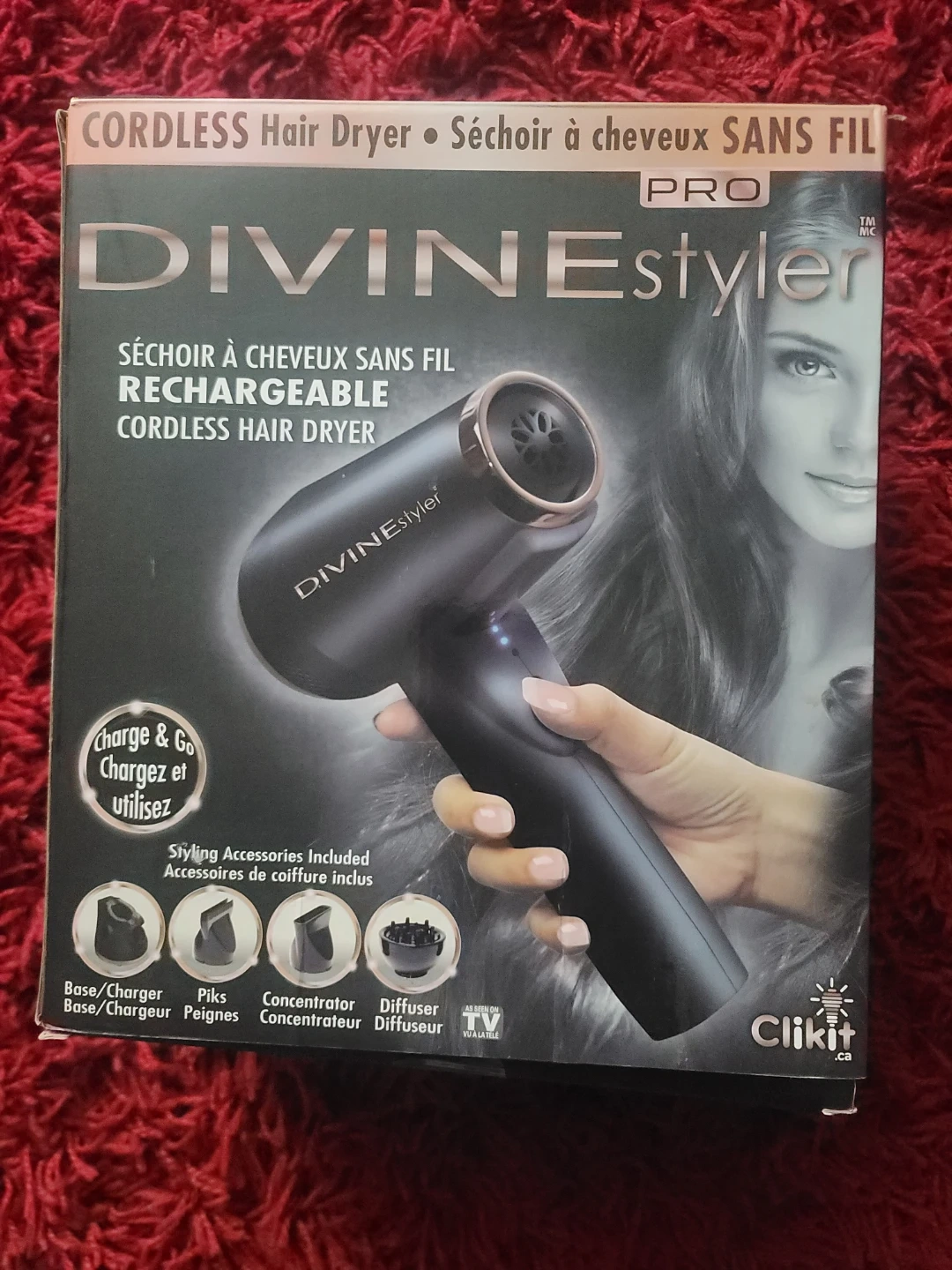 This is the DIVINE styler PRO cordless rechargeable hair dryer. It's black with gold accents and comes with a charge and go base and multiple styling accessories including a concentrator and diffuser. This dryer is great for travel or on-the-go touch-ups!
