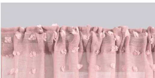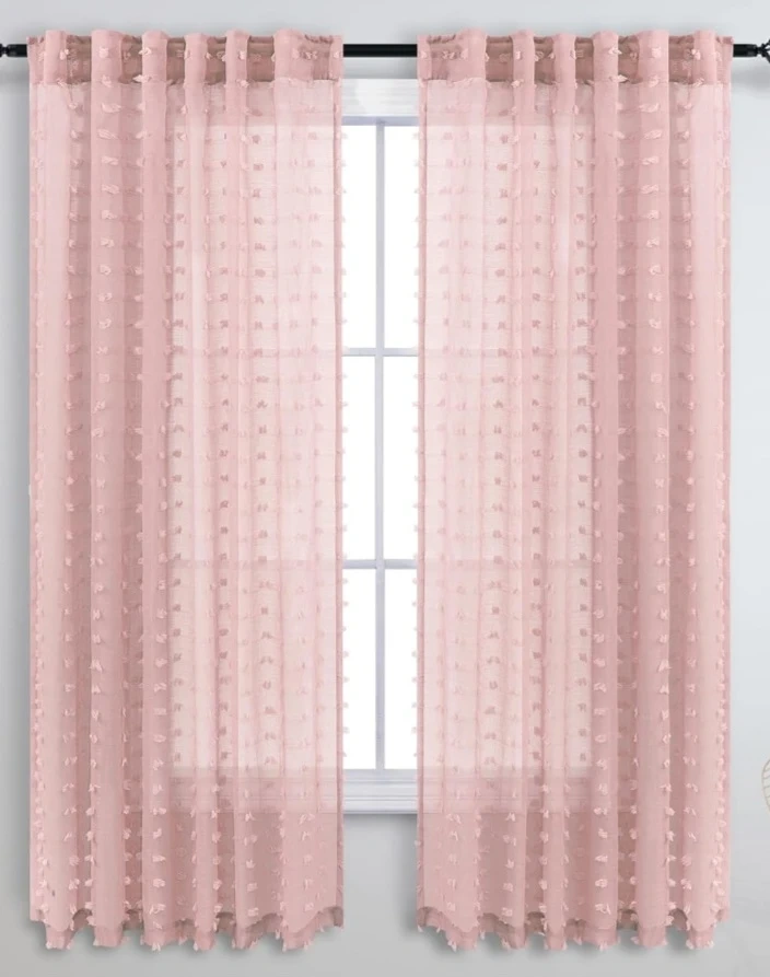 Add a touch of soft elegance to any room with these lovely pink sheer curtains. They feature a subtle pom pom texture throughout the fabric, creating a delicate and airy feel. Perfect for diffusing light and adding privacy.
