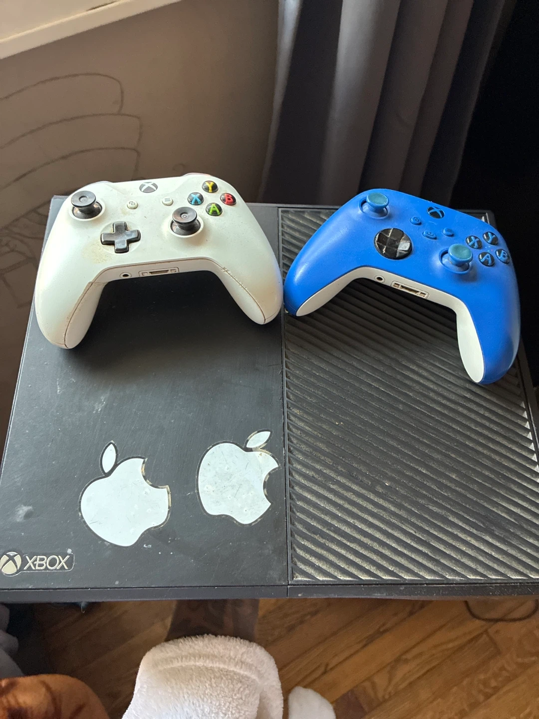 White and blue Xbox One controllers. Both controllers have standard button layouts and analog sticks. Controllers may show signs of wear.