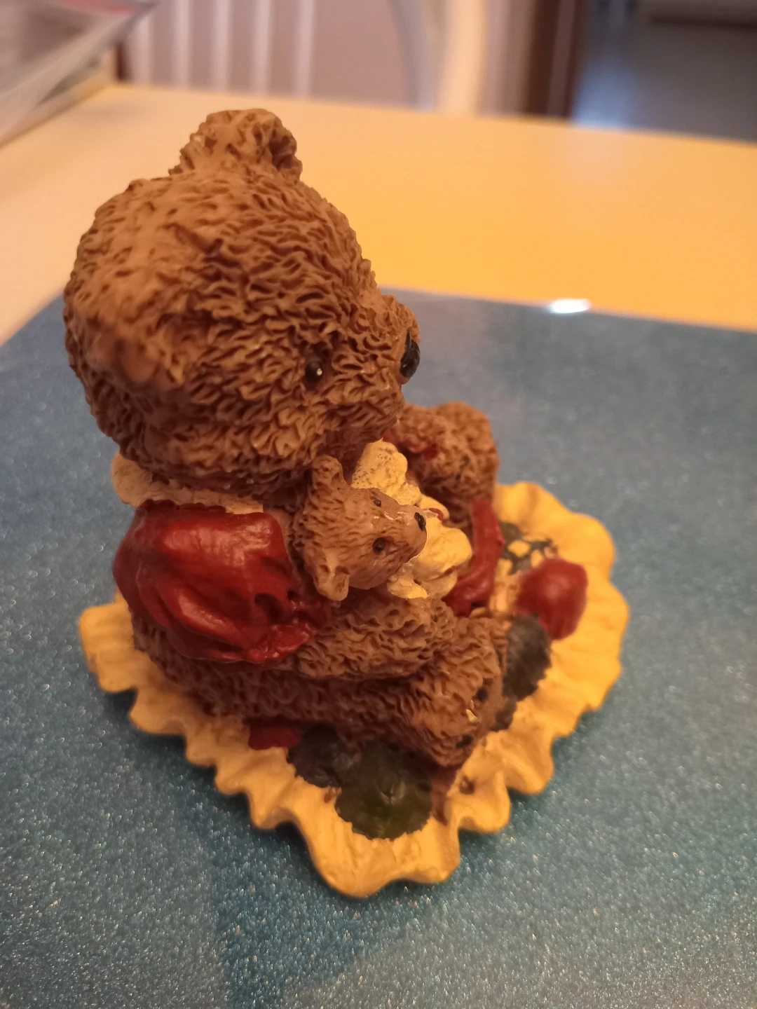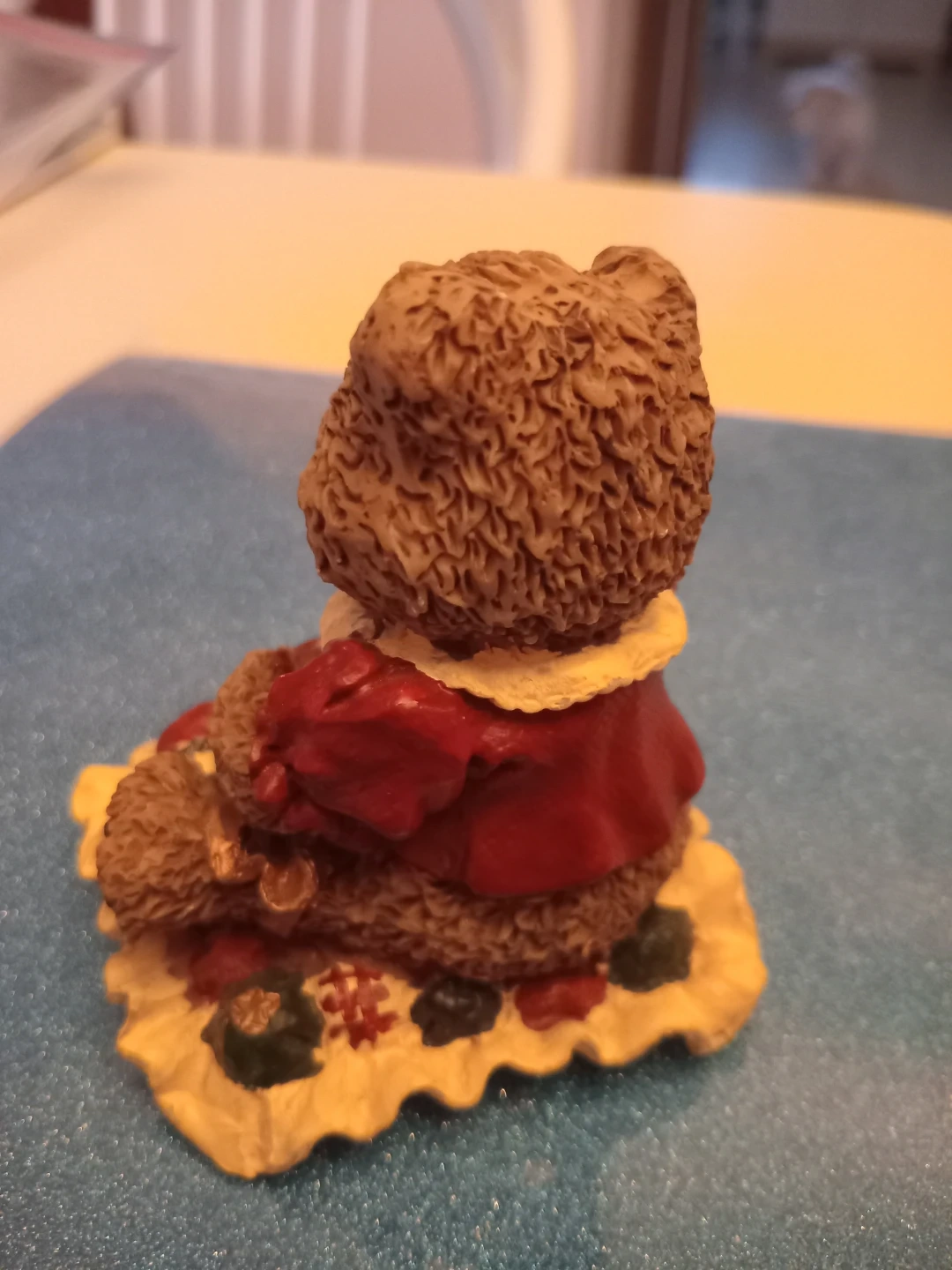 Selling a charming Boyds teddy bear figurine. From theWindsor Bear collection. It's a lovely piece for collectors or anyone who appreciates cute decor. The bear is holding a smaller bear and is wearing a red and cream coloured outfit. It's in good condition and ready to brighten up your space