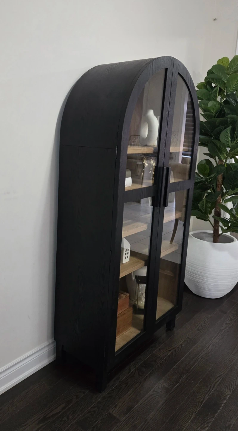Arched glass door display cabinet with black finish. Features adjustable wood shelves and two doors. It's perfect for showcasing decor or collectibles.