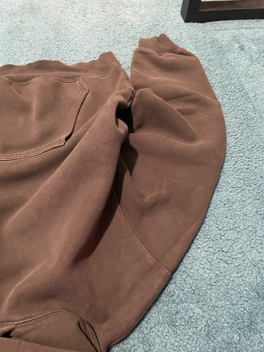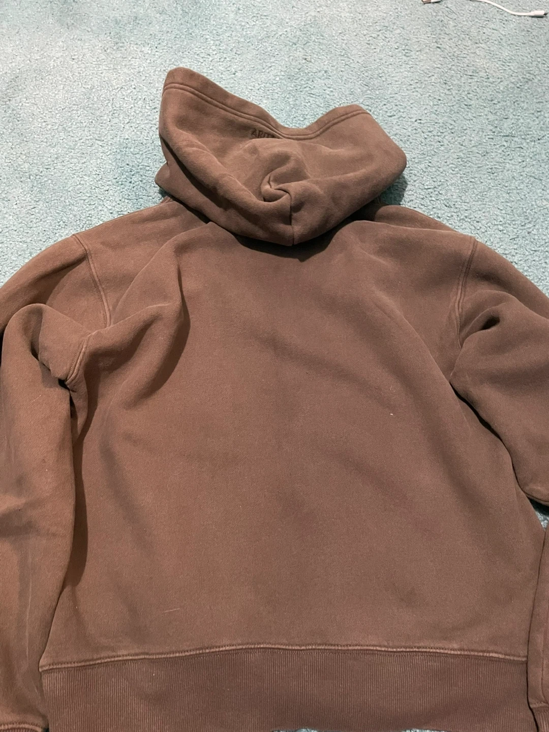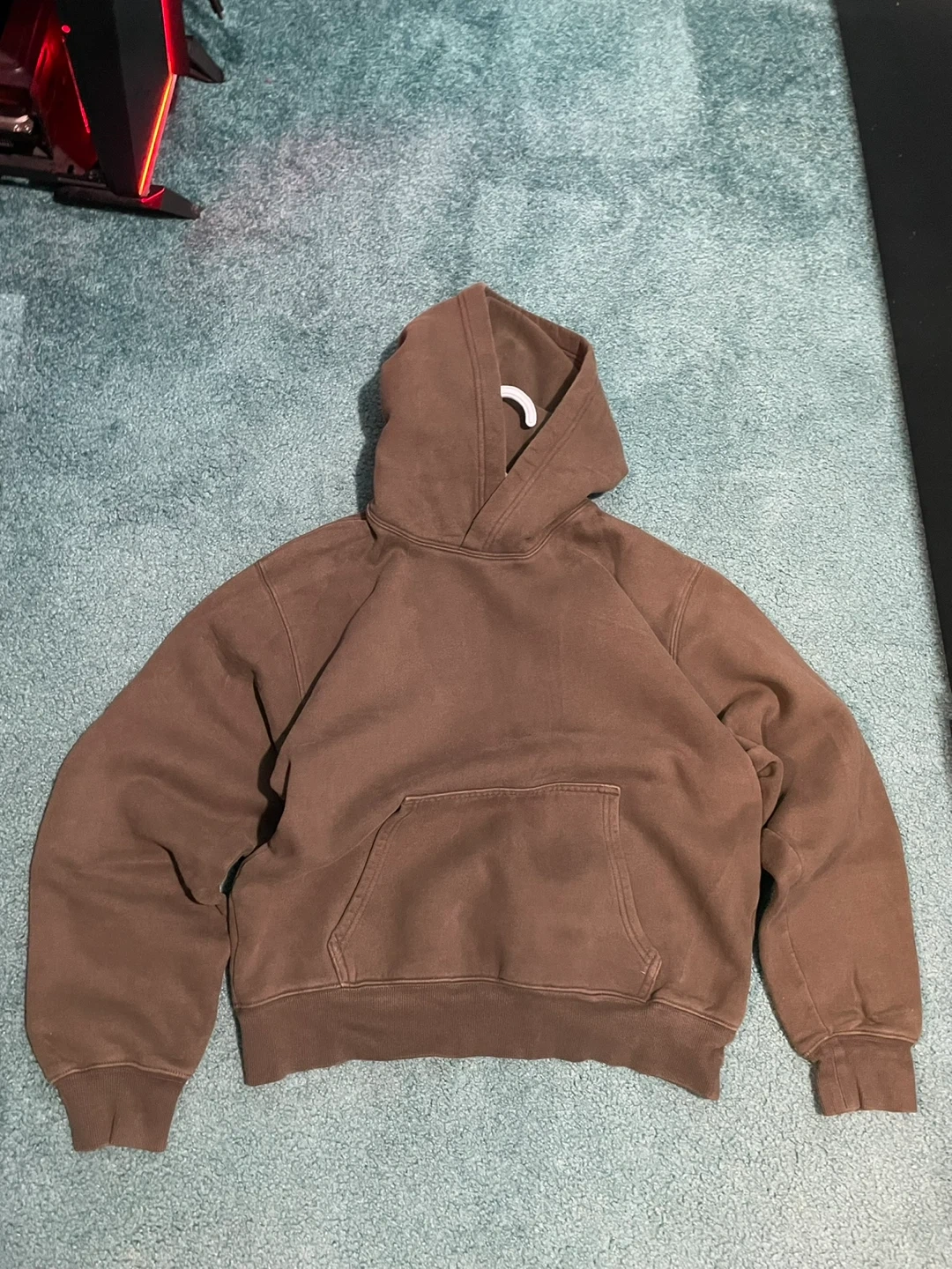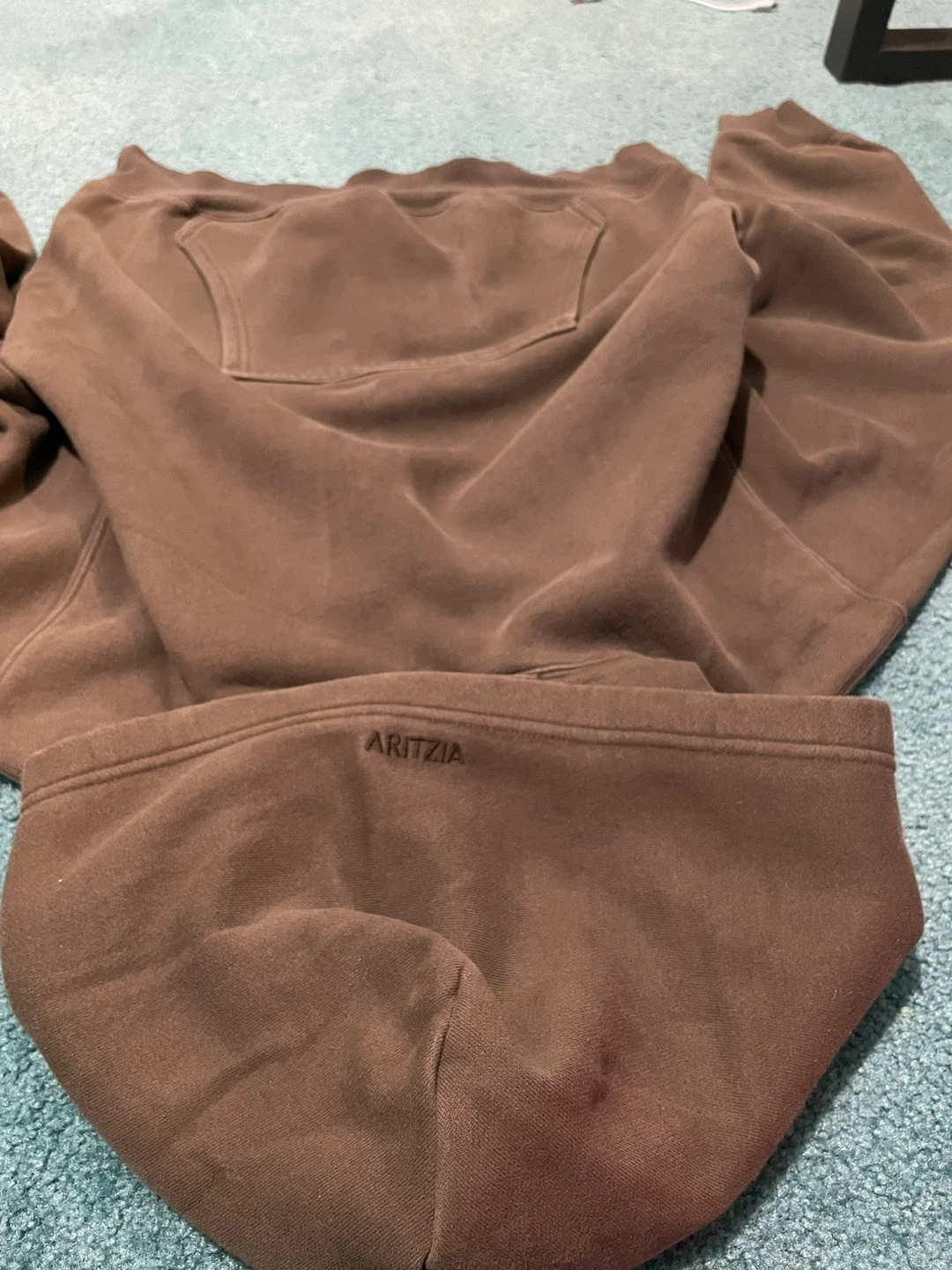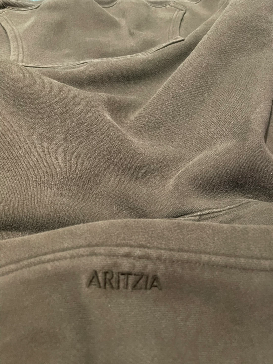 This Aritzia hoodie is made from their signature Sweatfleece fabric. It's a size small and comes in a dark green colour. It features a front pouch pocket.