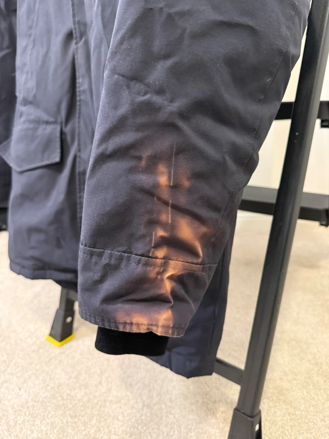 There is a small area of discoloration on one sleeve cuff due to heat exposure. This is purely cosmetic and does NOT affect the performance or warmth of the jacket.