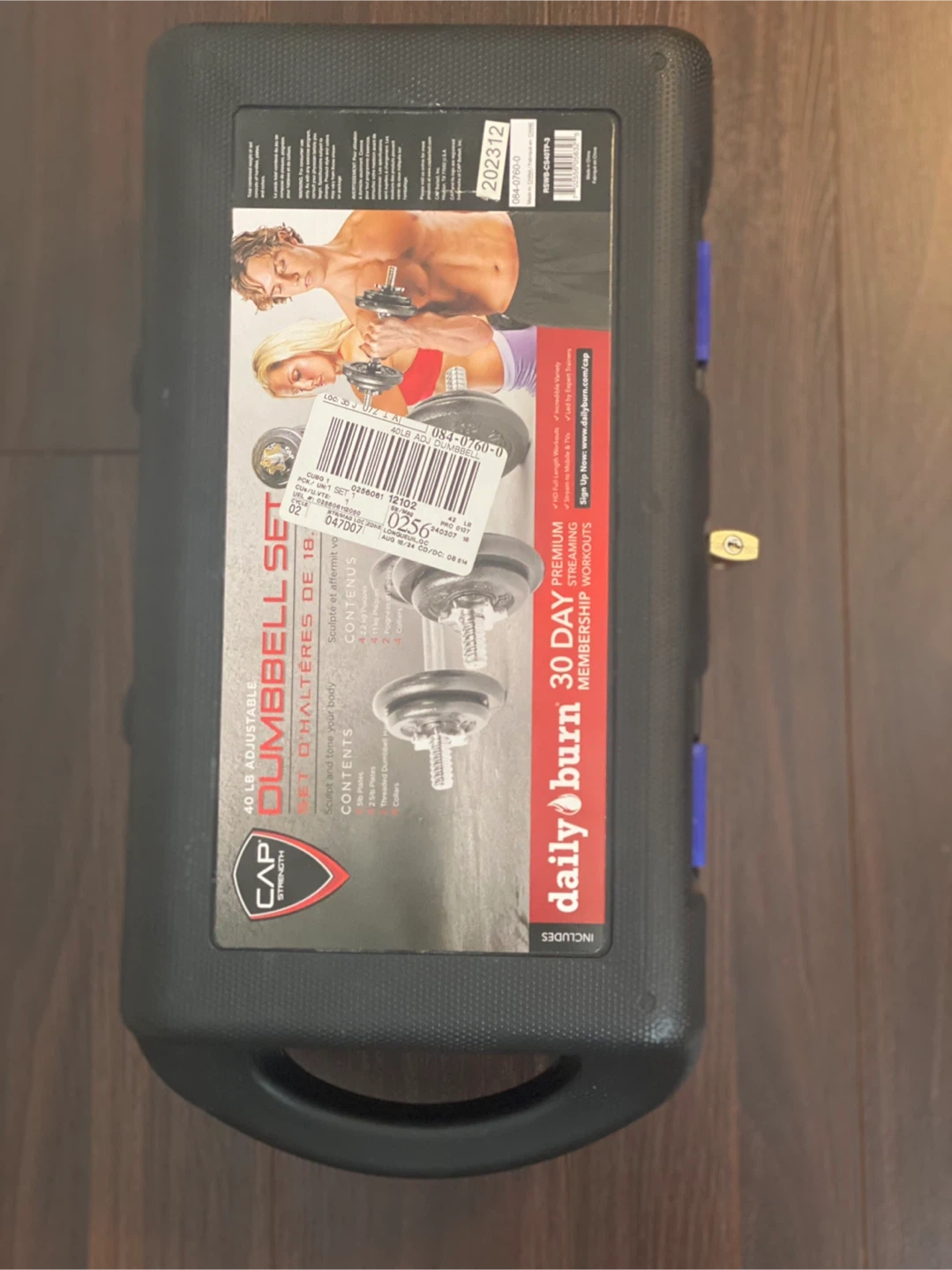 CAP Strength 40 lb adjustable dumbbell set with case. Includes 2 dumbbell bars, 4 collars, and 8 weight plates. Adjustable weights for custom workouts.