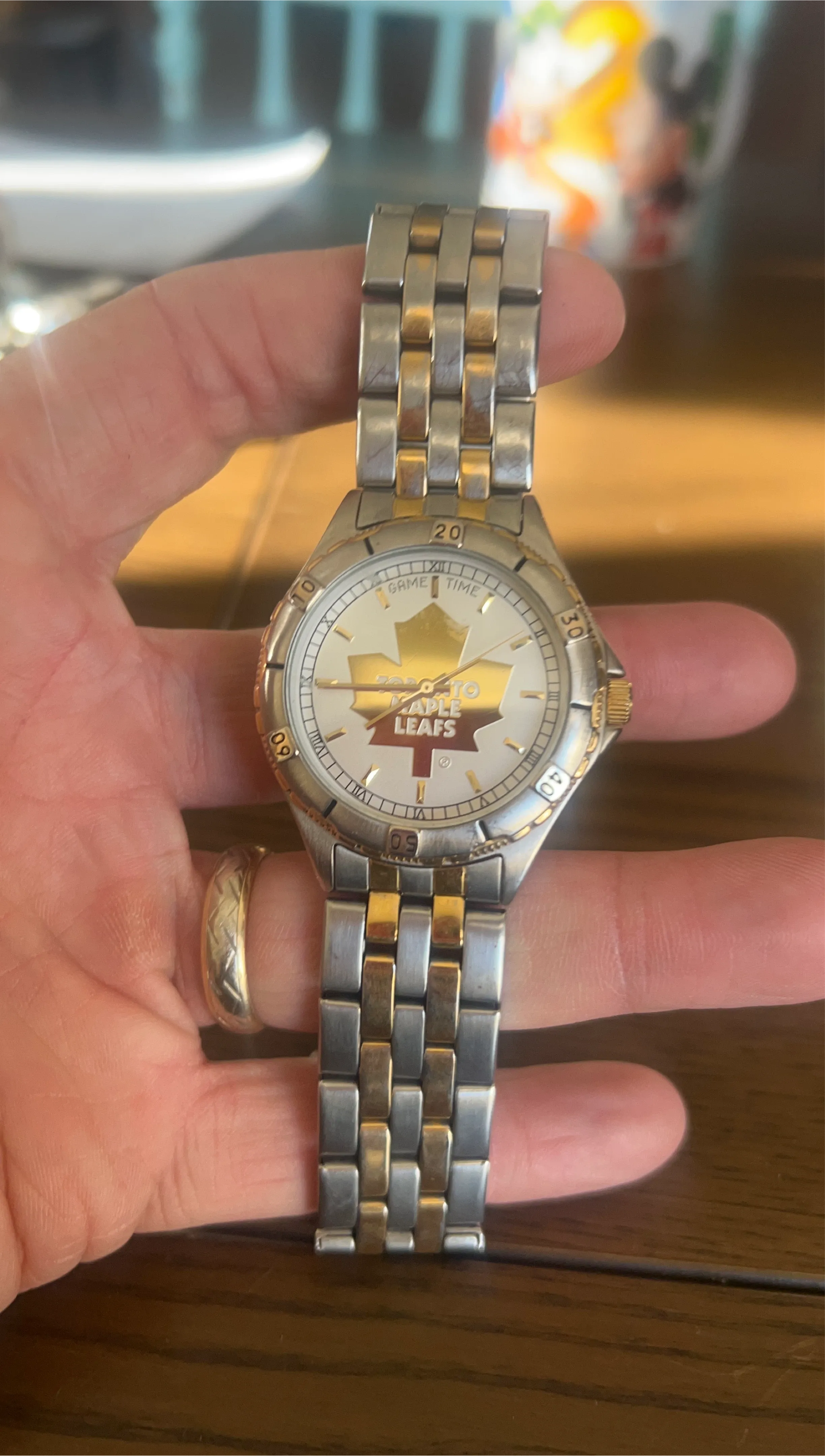 Selling a Toronto Maple Leafs Game Time watch. It features a silver and gold band with the Leafs logo on the face. A great accessory for any Leafs fan!