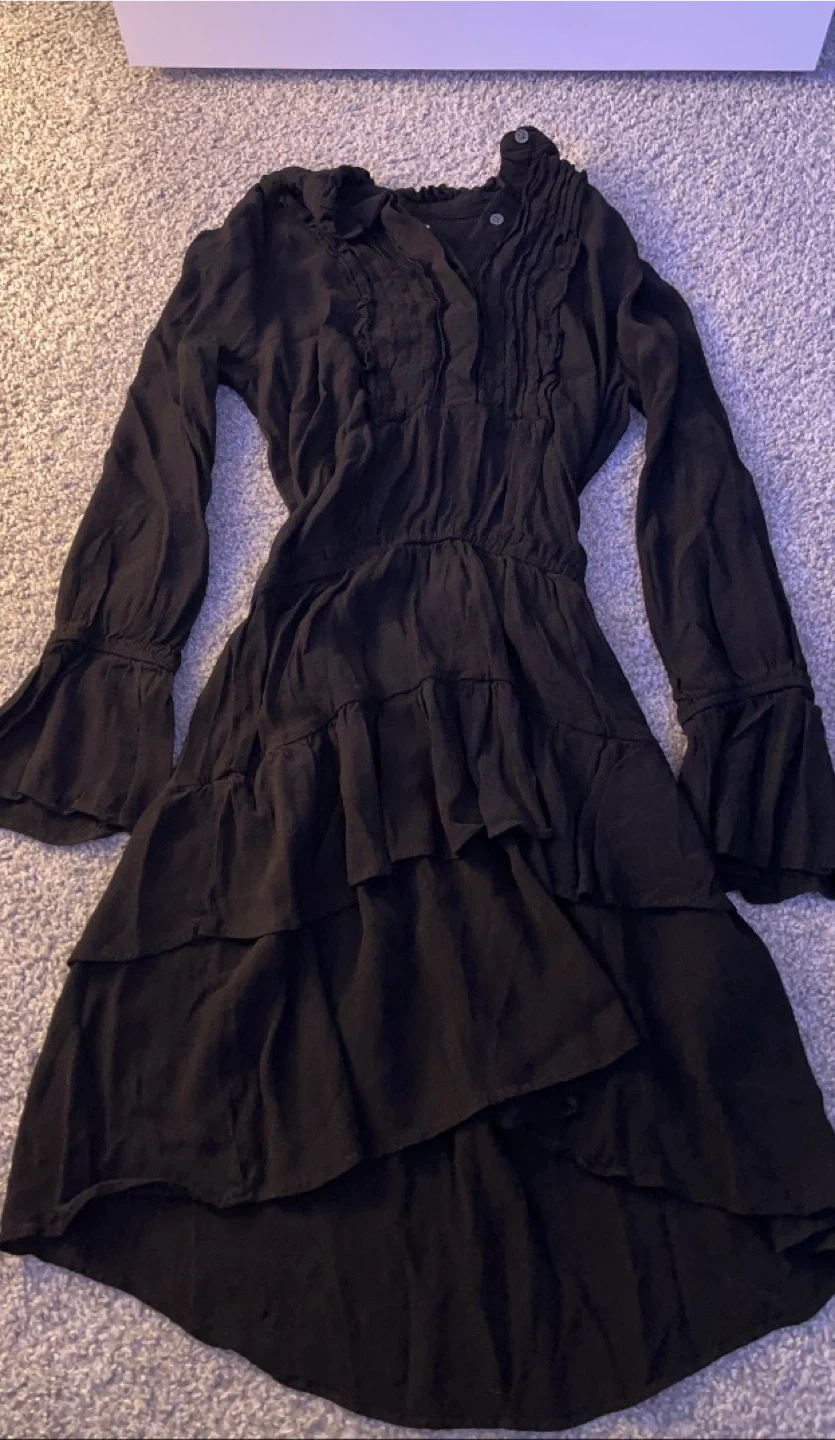 Flowy black dress with ruffled detailing on the bodice and tiered skirt. Features long bell sleeves. Material is lightweight and flowy.