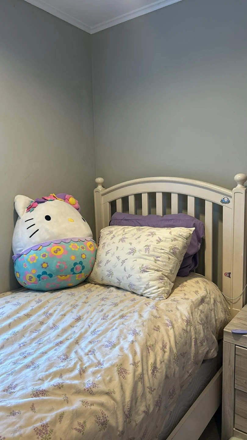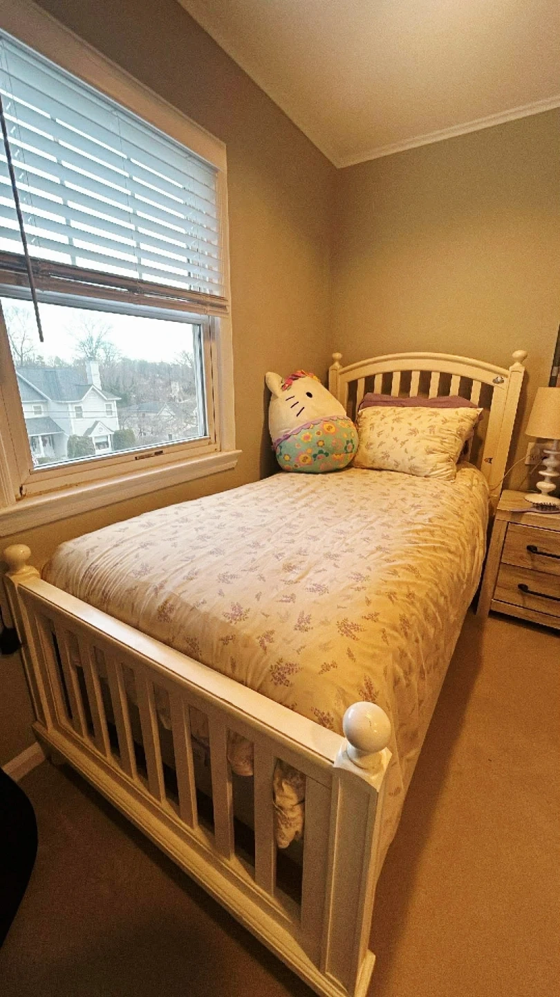 White twin bed frame with a classic slatted headboard and footboard. This bed frame is made of sturdy wood and features a clean, timeless design. It's perfect for a child's room or a guest bedroom! Mattress NOT included.