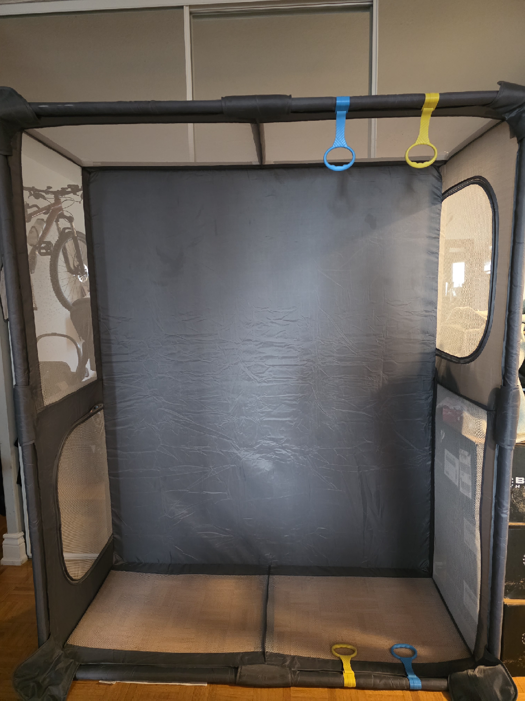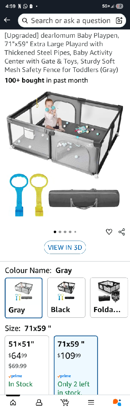 Selling a dearlomum baby playpen in gray! I only used it for 3 months so its fairly new and well kept. It's 71x59 inches, providing a good amount of space for your little one to play safely. It features thickened steel pipes and a sturdy soft mesh safety fence, making it a great baby activity center with a gate and toys. Perfect for toddlers!