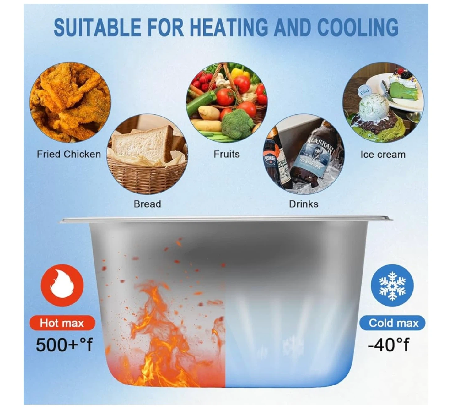 This stainless steel food pan is designed for both heating and cooling. It's suitable for temperatures up to 500°F and down to -40°F. Great for storing and serving a variety of foods, from fried chicken to ice cream!