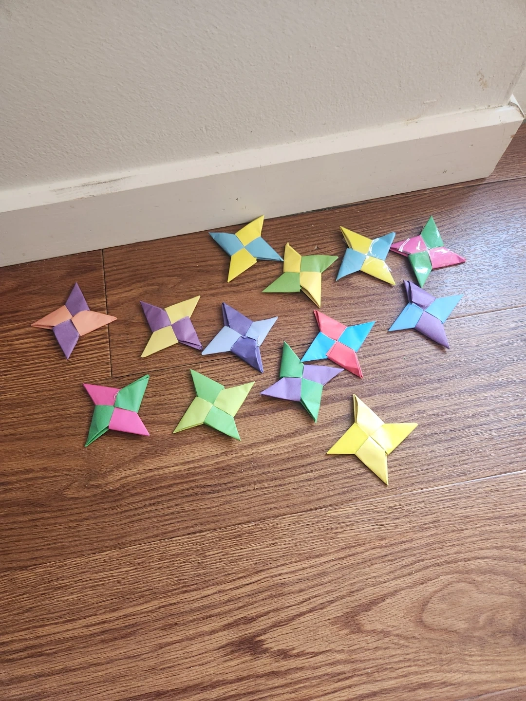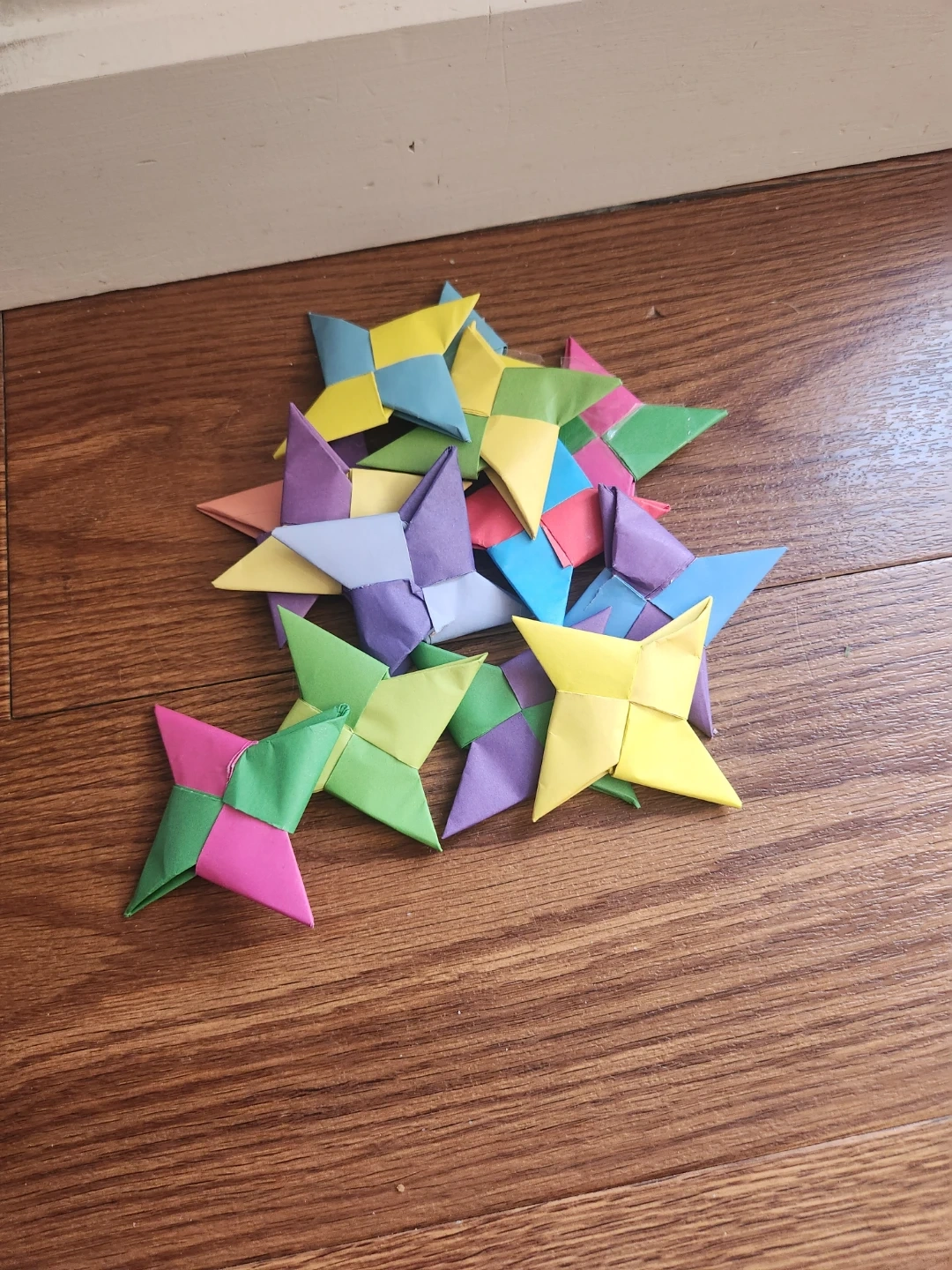 16 paper origami shurikens good for pretend play or just as a decoration. (Picture only has 13 because I haven't actually taken new pictures but there are 16)